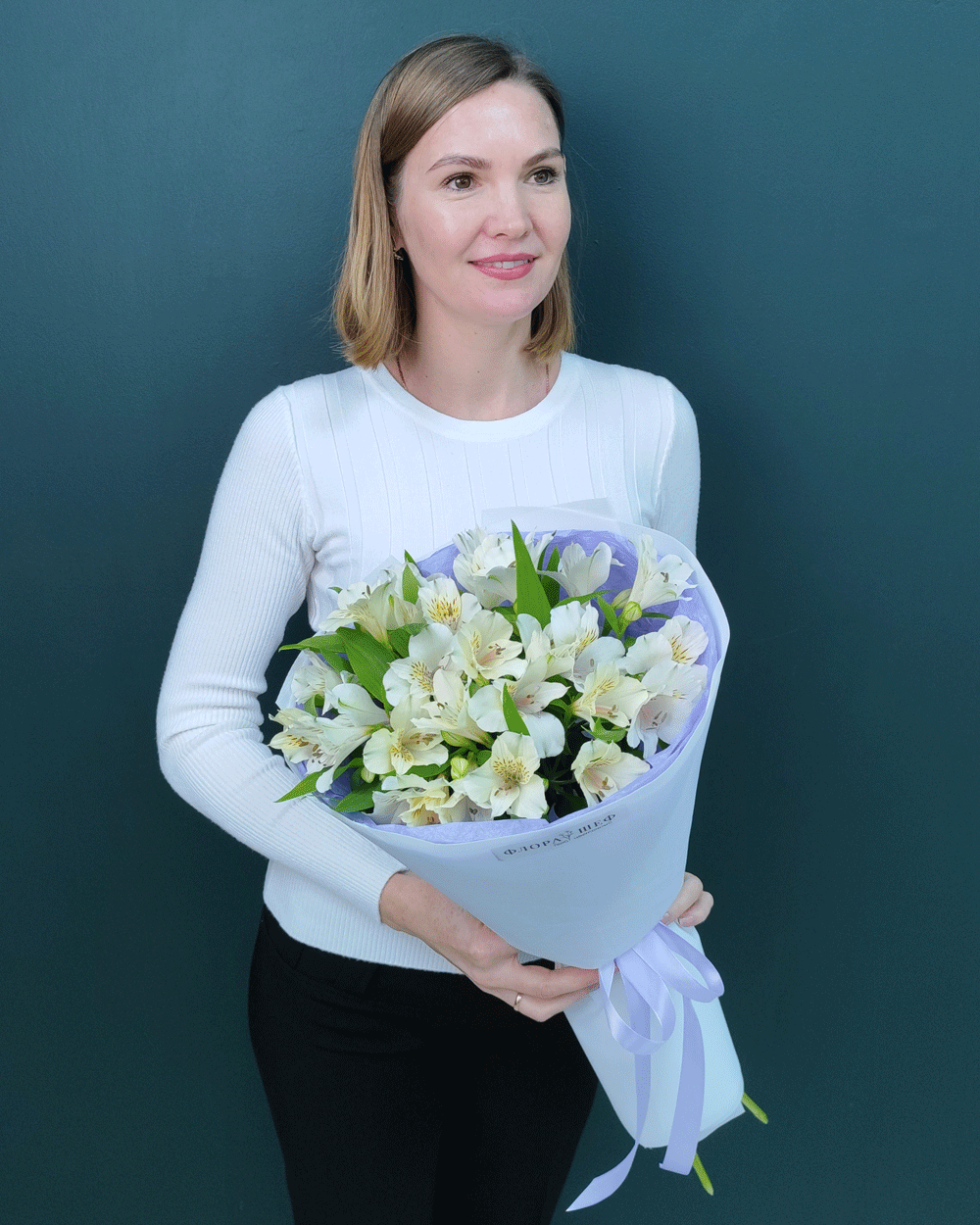 Изысканный букет из 5 веток белой альстромерии – идеально подходит для знака внимания, благодарности, романтического комплимента, выписки из роддома, крещения, свадебных композиций или просто чтобы выразить свое уважение и теплые чувства без лишнего пафоса.