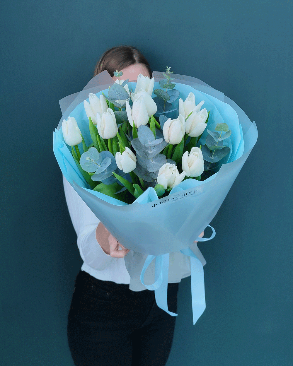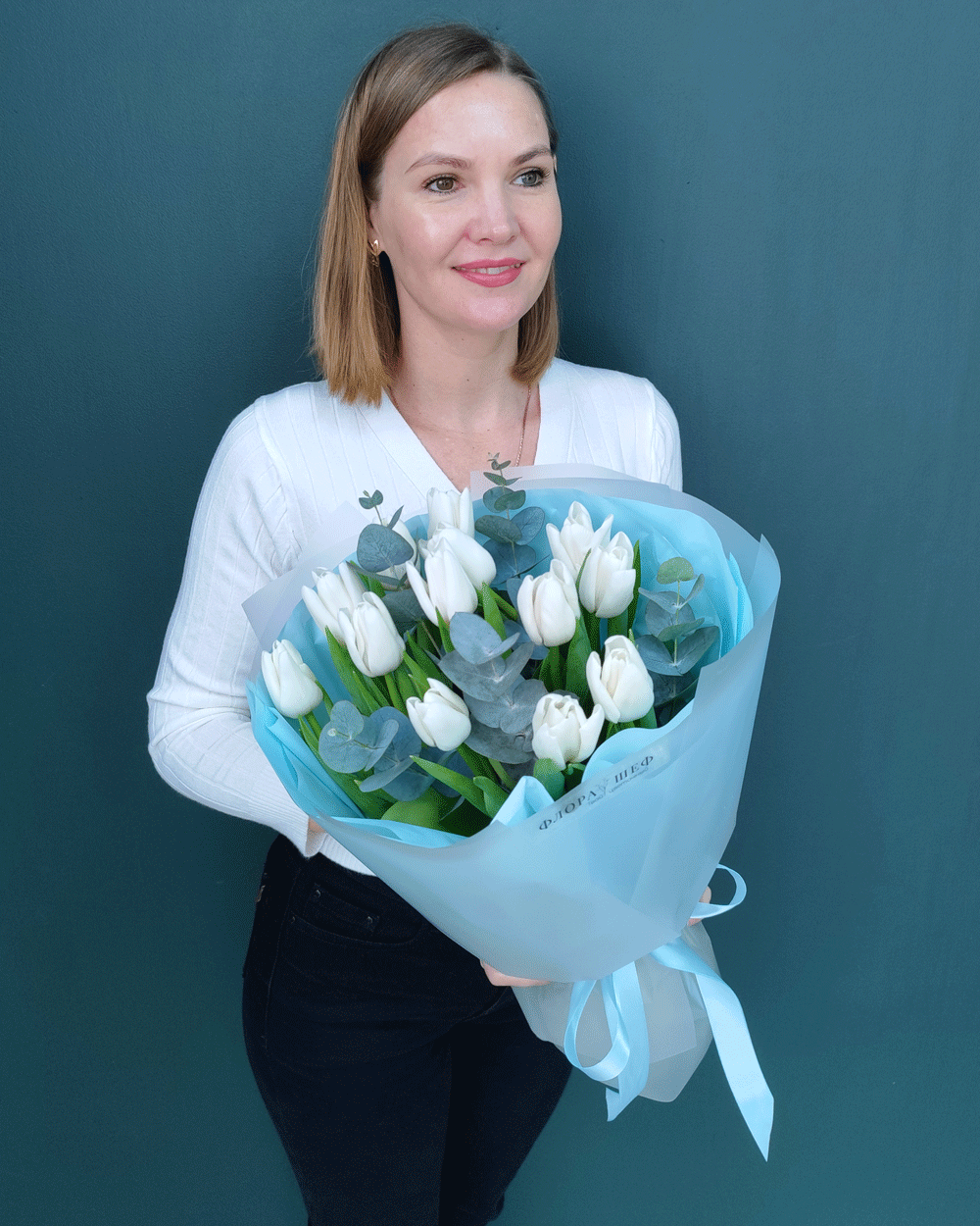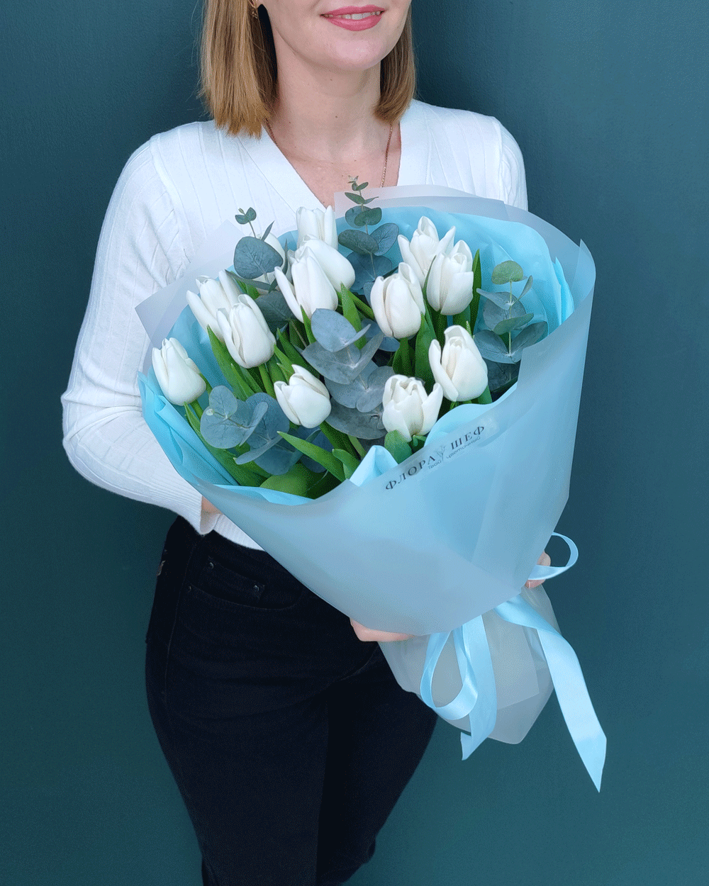 Безупречное сочетание для любителей минимализма и благородной эстетики. Белоснежные тюльпаны в паре с веточками серебристого эвкалипта создают образ утонченного, «дорогого» букета. Эта композиция наполнена прохладой и нежностью, она идеально подойдет как для романтического свидания, так и в качестве стильного бизнес-подарка.