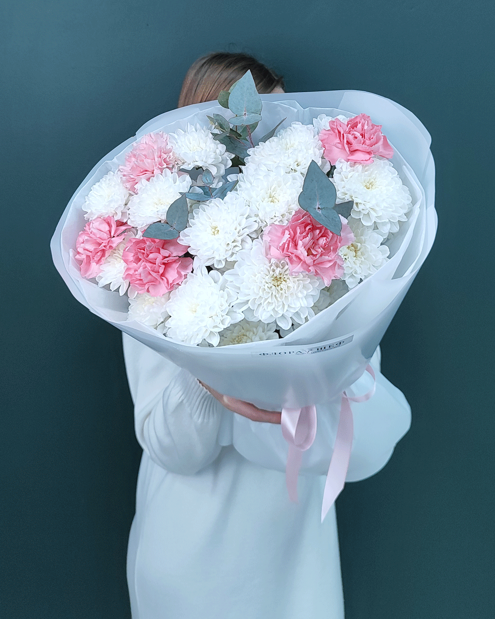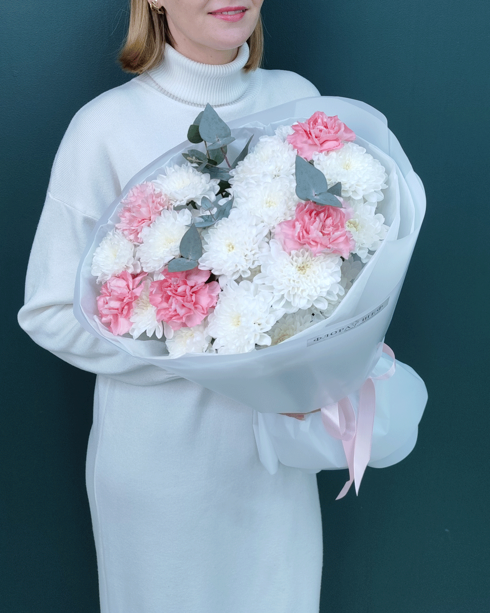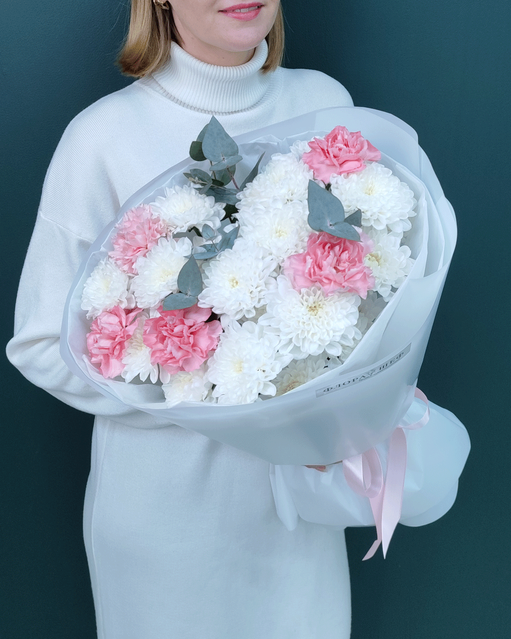 Сбалансированный букет подойдёт для дня рождения, поздравления или универсального подарка без повода. Диантусы добавляют аккуратную форму, хризантема — объём, а эвкалипт завершает композицию свежими зелёными нотами.