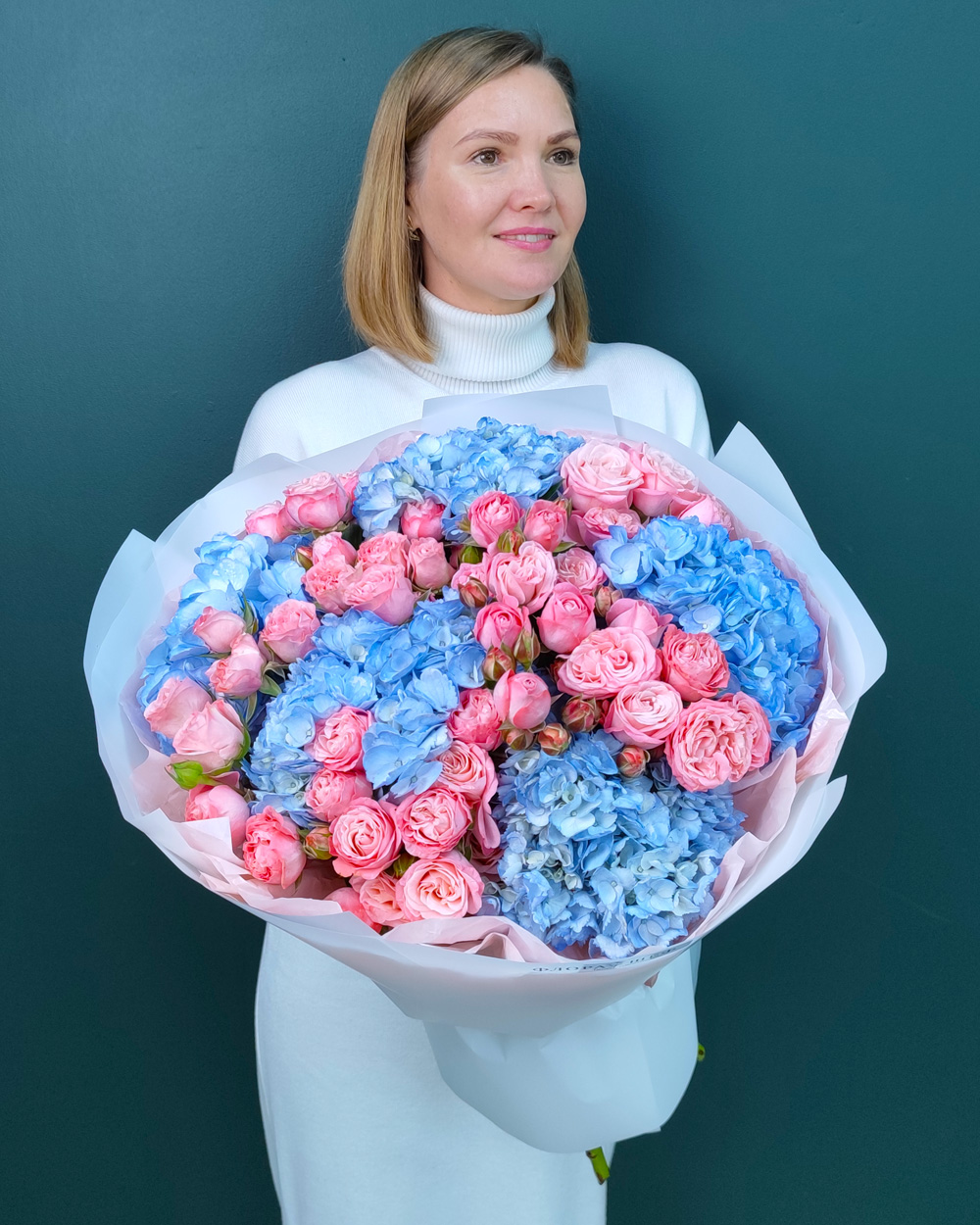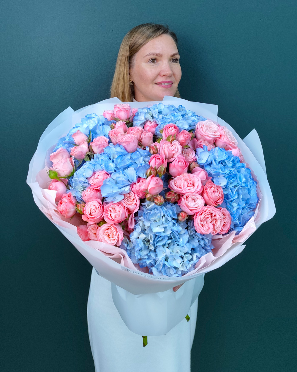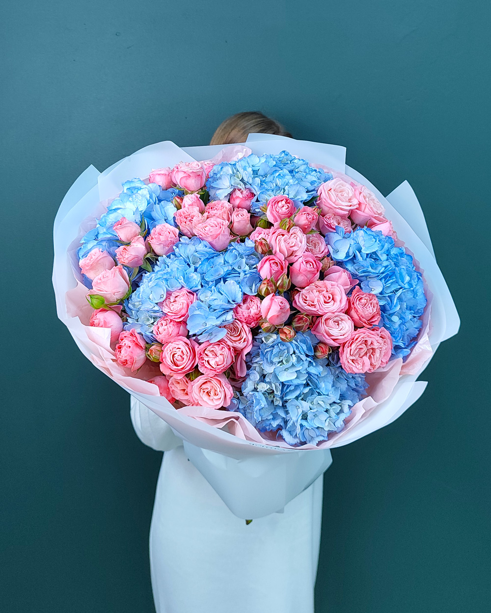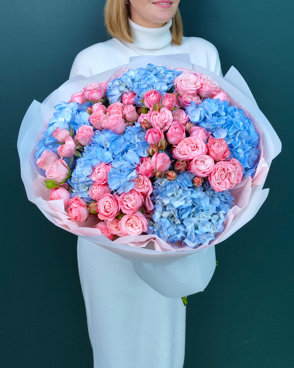 Нежный букет из голубой гортензии и кустовых роз подойдёт для подарка на день рождения, свадьбу или романтический повод. Сочетание воздушной гортензии и изящных роз создаёт лёгкий, утончённый образ.