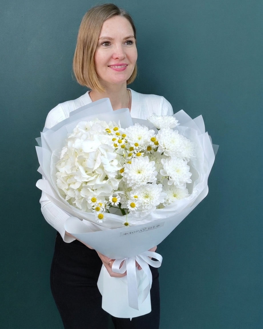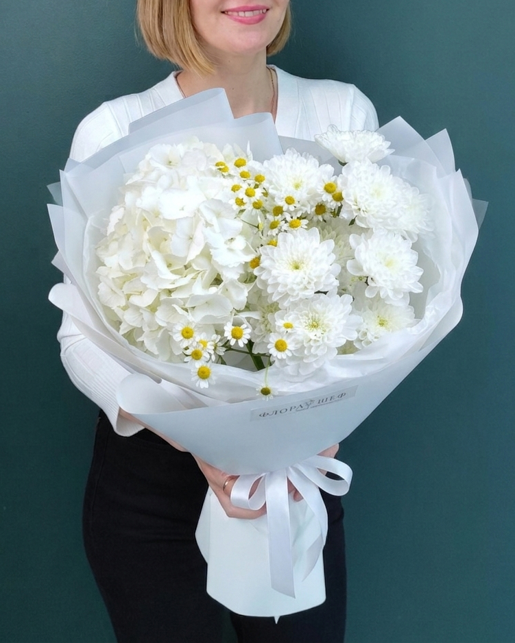 Облако нежности: Гортензия, хризантемы и ромашки