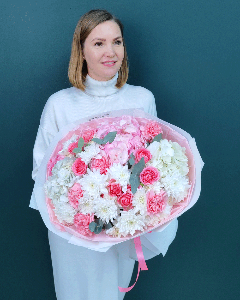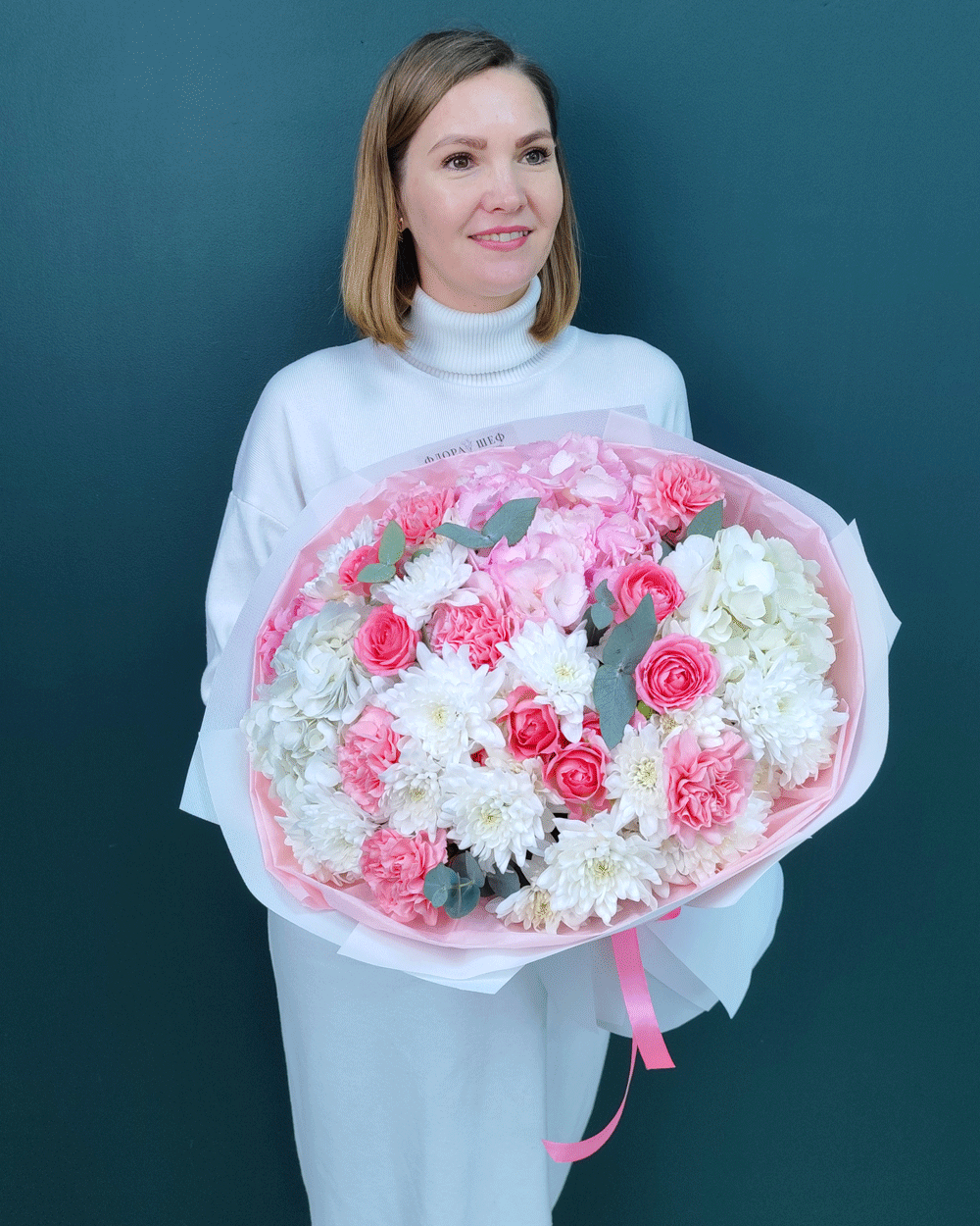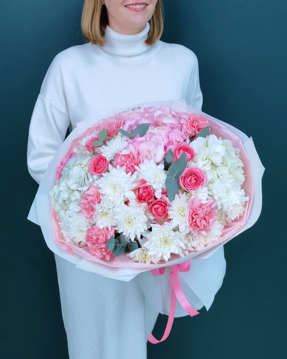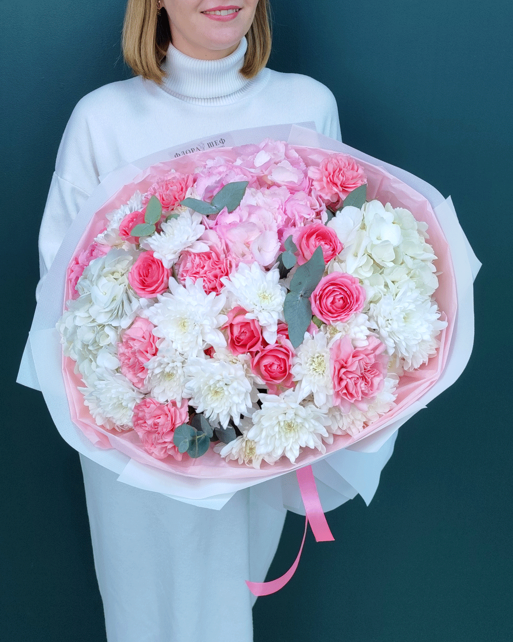 Этот букет — настоящий праздник фактур и оттенков. Мы собрали в нем всё самое лучшее: пышную гортензию для объема, стойкую хризантему и современные диантусы для долговечности, а также нежную кустовую розу для романтичного настроения. Завершающий штрих — веточки ароматного эвкалипта, которые придают композиции благородный вид и свежесть.