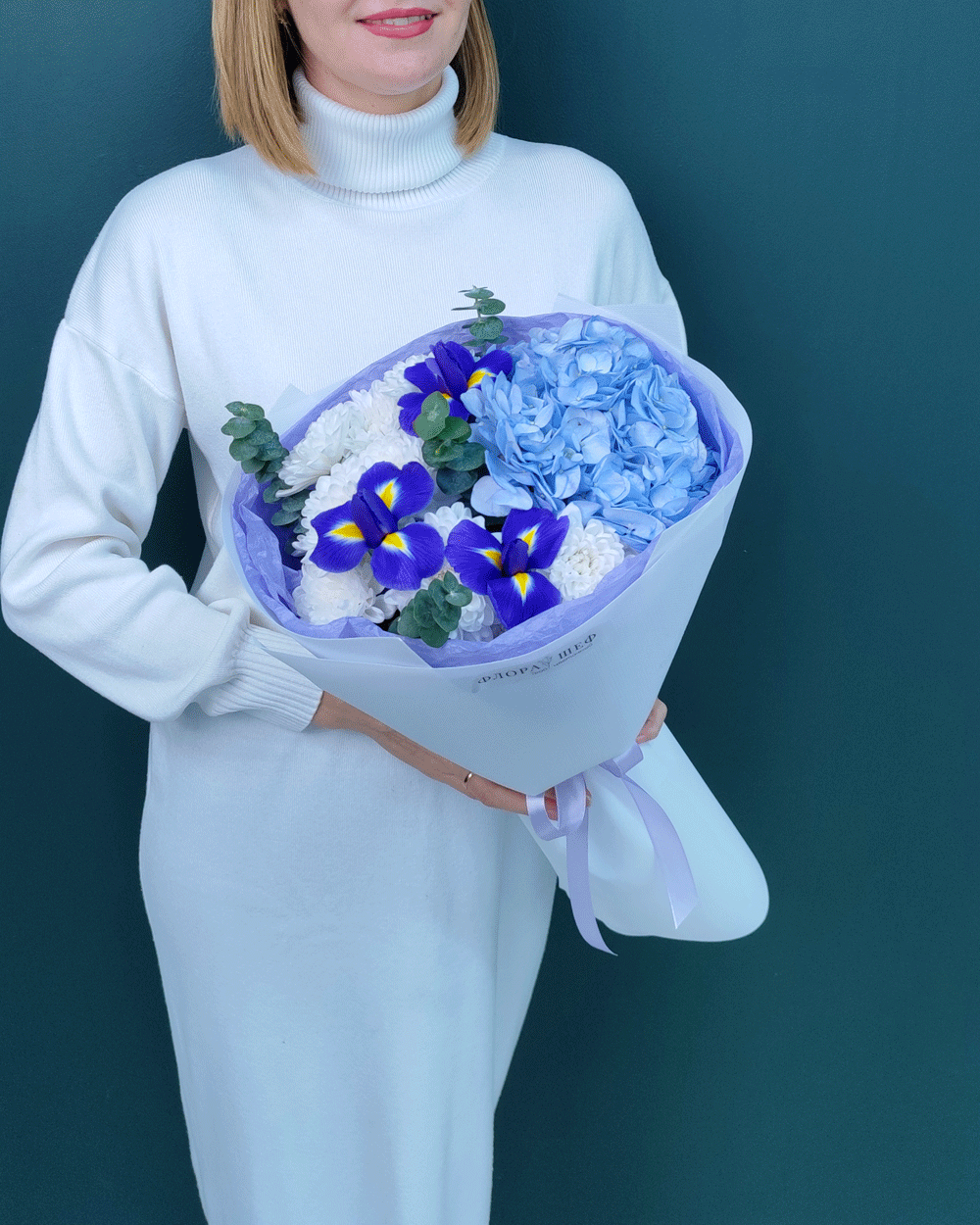 Стильное сочетание нежной гортензии, глубоких по цвету ирисов и стойкой хризантемы. Букет привлекает внимание игрой контрастов и объемом, выглядя по-настоящему изысканно и дорого.