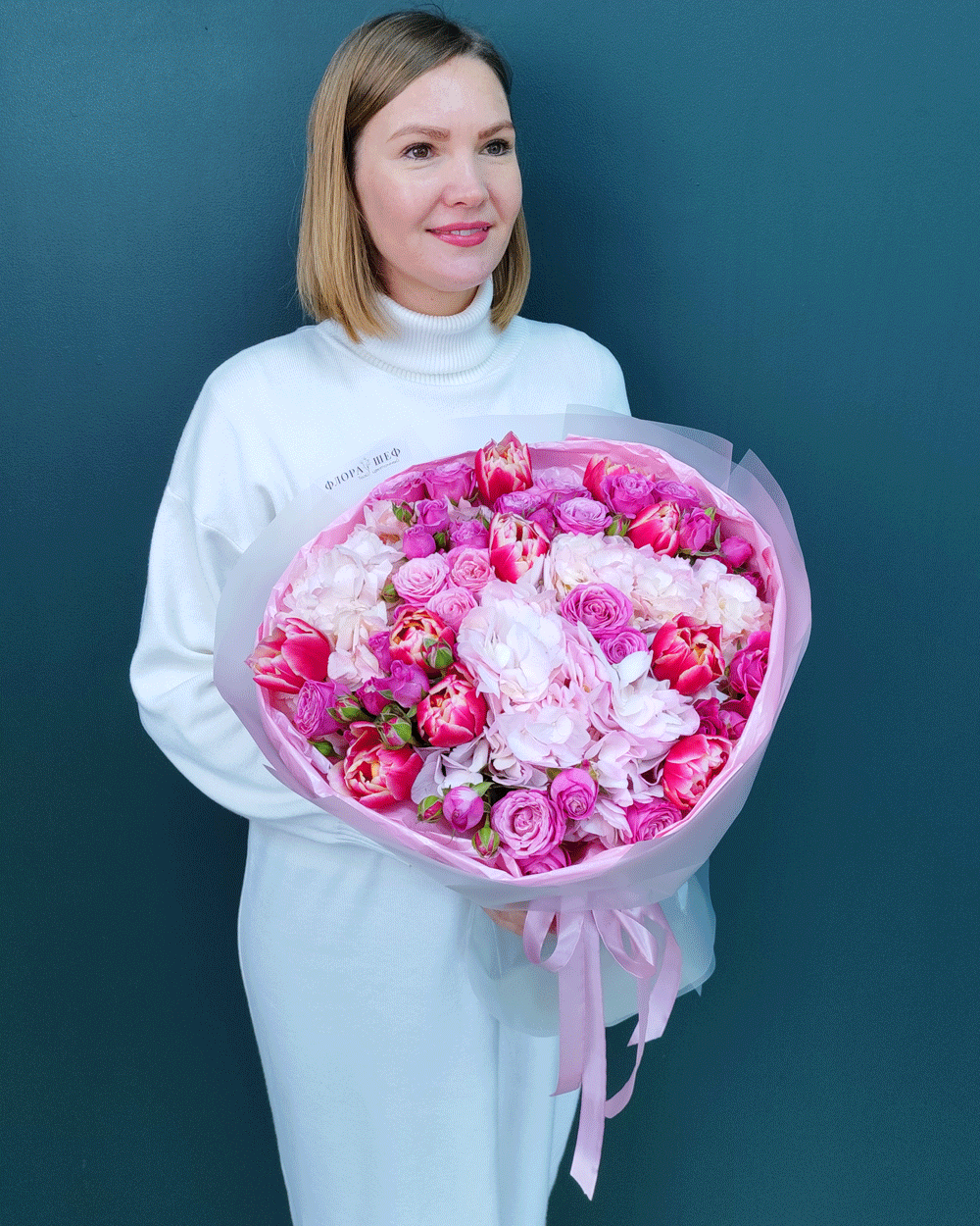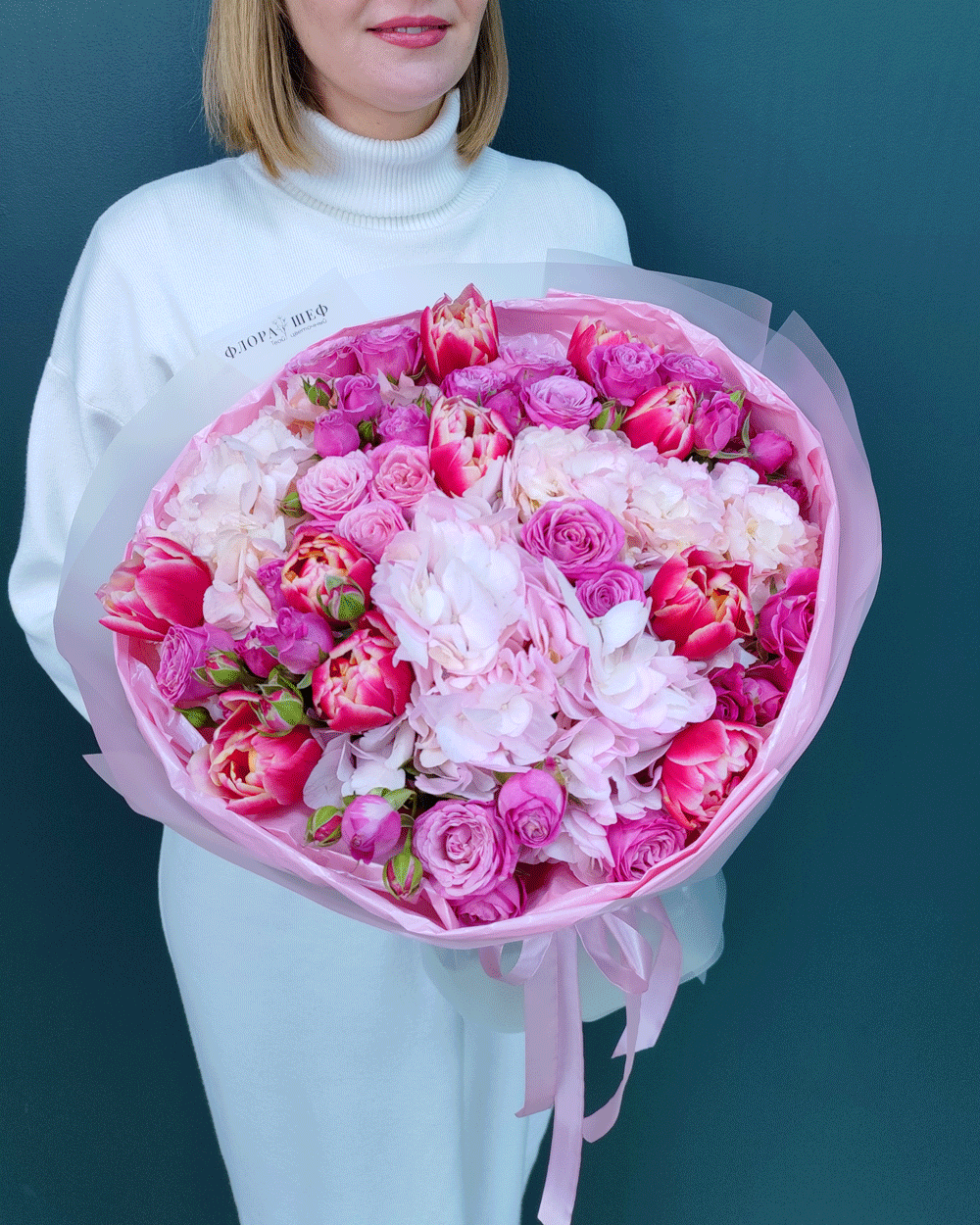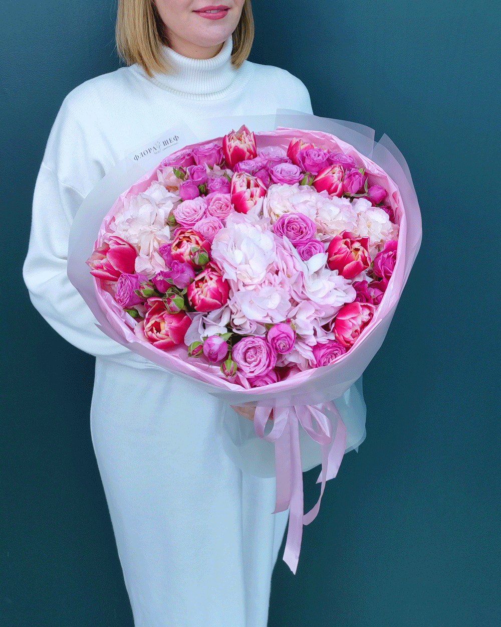 Этот букет — воплощение легкости и многогранной красоты. В одной композиции мы соединили три главных фаворита: величественную гортензию, создающую невероятный объем, нежные весенние тюльпаны и изящную кустовую розу. Сочетание разных фактур делает букет живым, глубоким и по-настоящему праздничным.