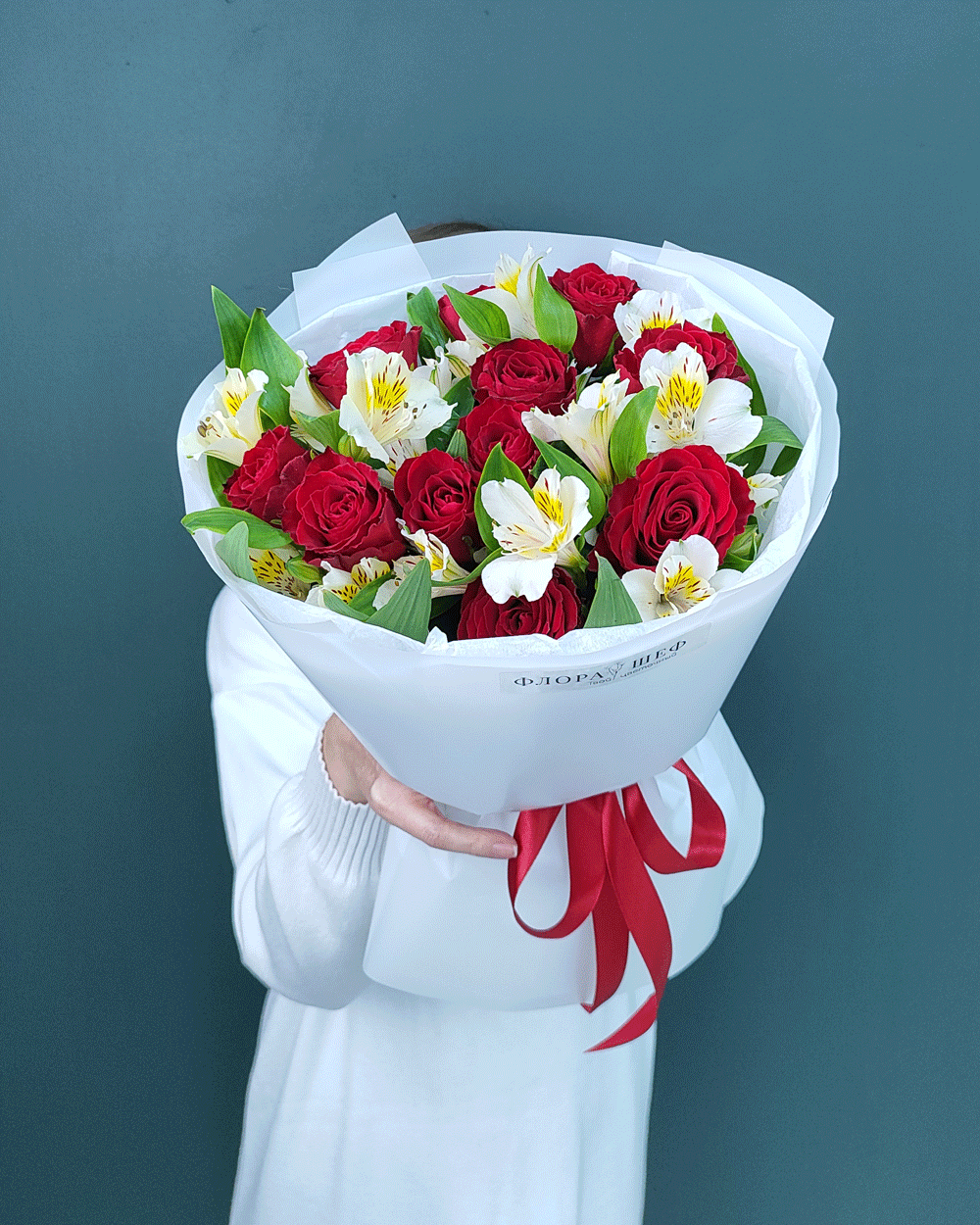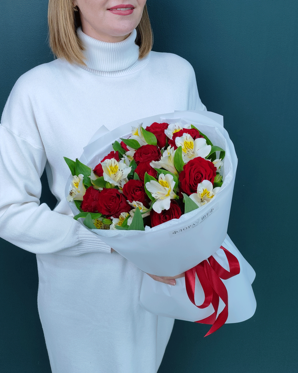 Беспроигрышное сочетание классической красной розы и пышной альстромерии. Этот букет выглядит эффектно, символизируя глубокие чувства и искреннюю привязанность.
