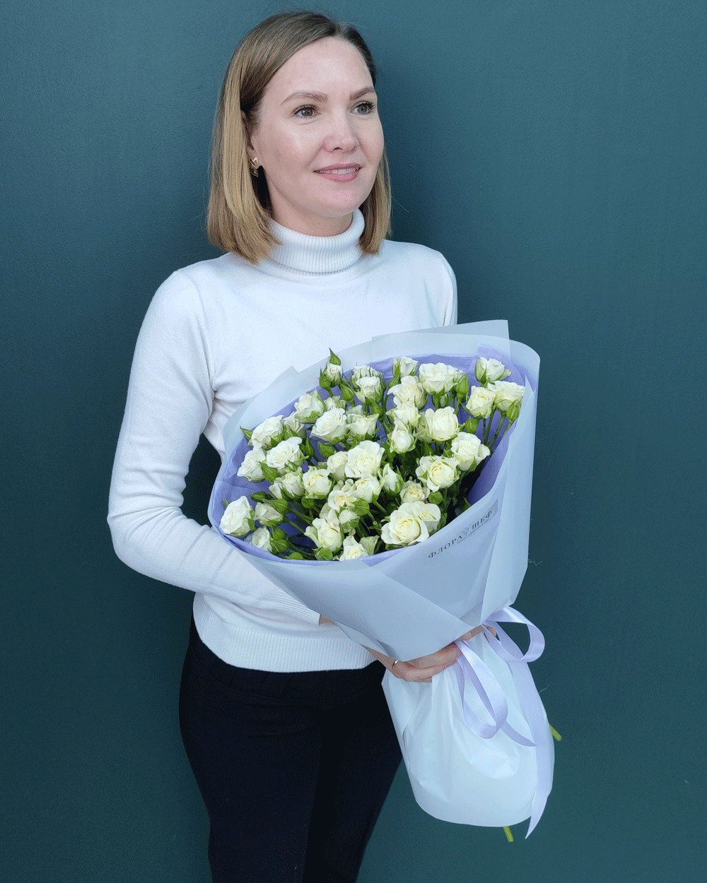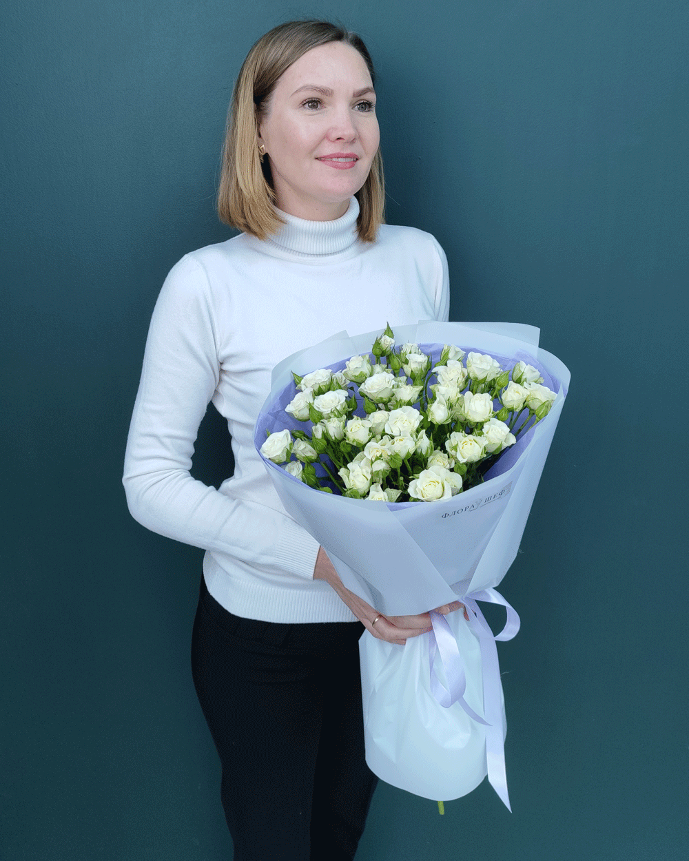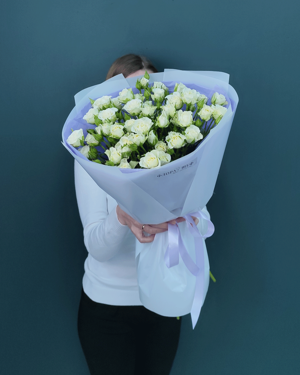 Изящный и воздушный букет, который выглядит невероятно пышно за счет множества мелких бутонов на каждой ветке. Белая кустовая роза — это символ искренности и легкости, идеальный подарок для самых трепетных моментов.