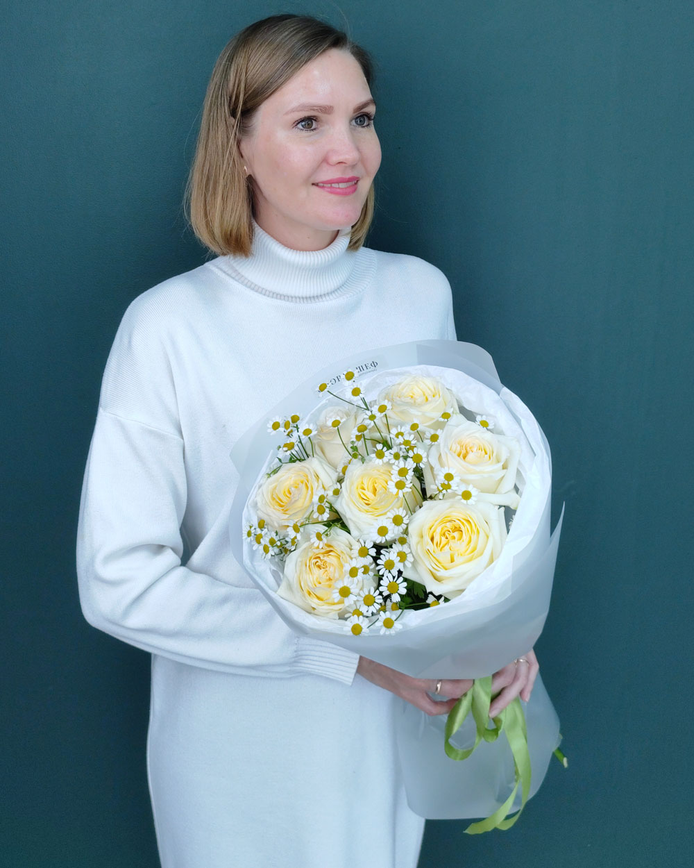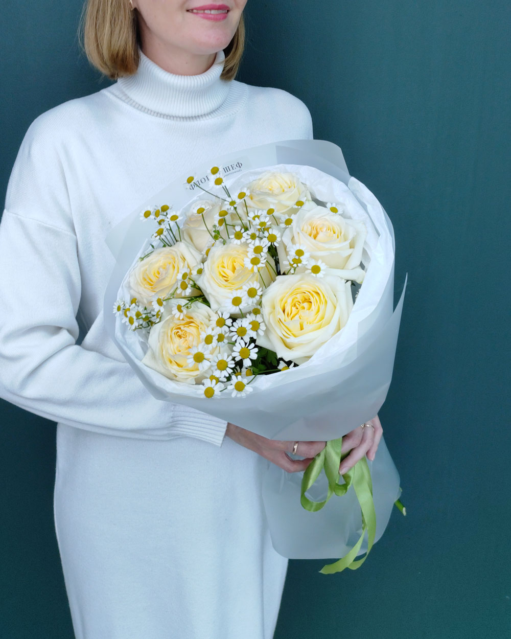 Объем и фактура: Роза этого сорта раскрывается очень широко, а ромашки заполняют пространство между бутонами, делая букет воздушным и «живым».