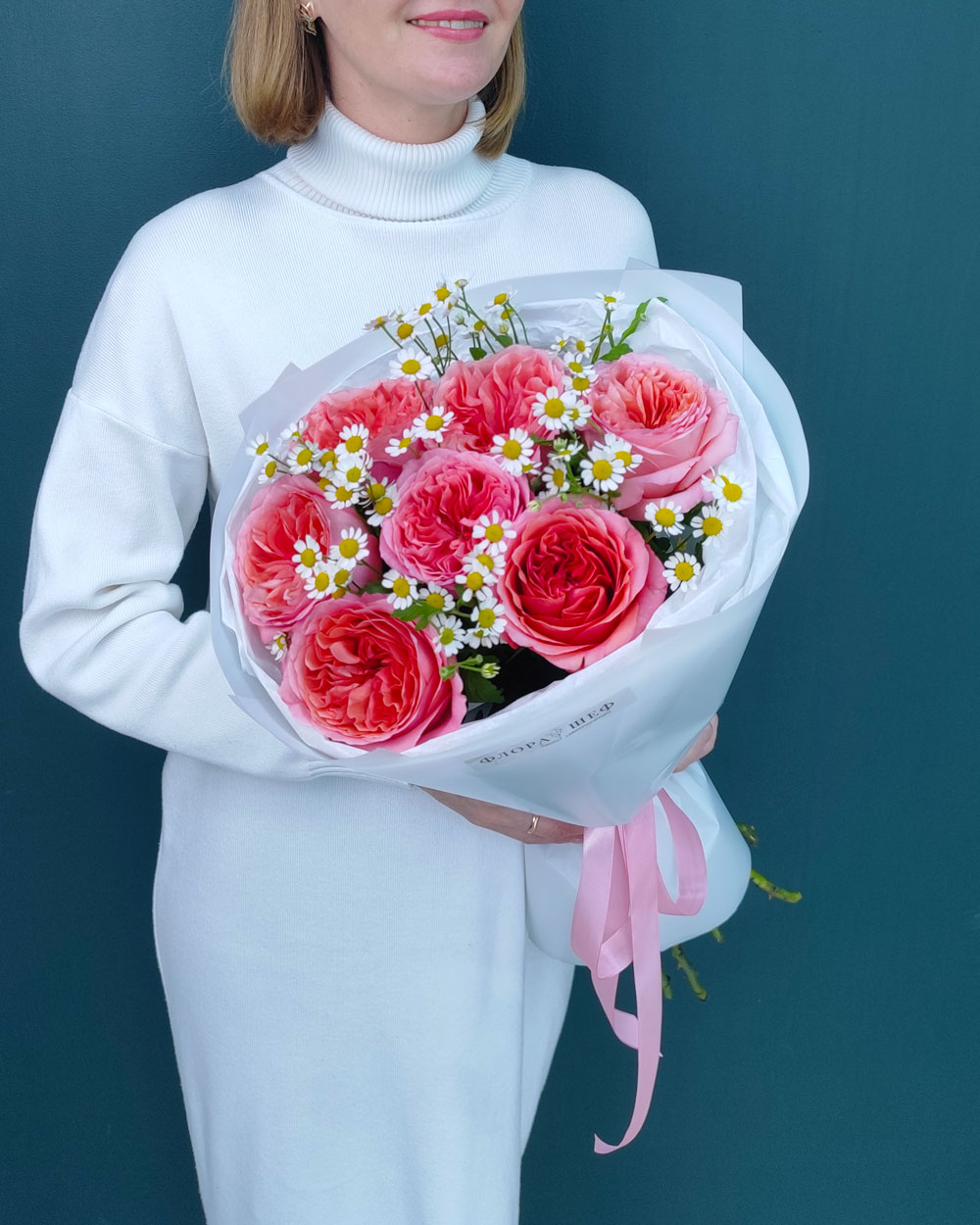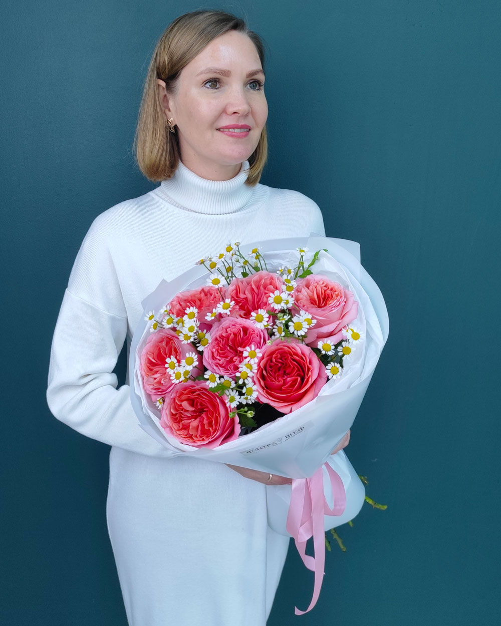 Этот букет — идеальный пример того, как высокая флористика встречается с природной искренностью. Главная героиня здесь — роза Pink Expression. Её густомахровый, почти «кудрявый» бутон насыщенного розового цвета выглядит невероятно статусно. Но стоит добавить к ней россыпь мелких полевых ромашек, как букет превращается в легкую, воздушную и очень уютную композицию в стиле «Прованс».