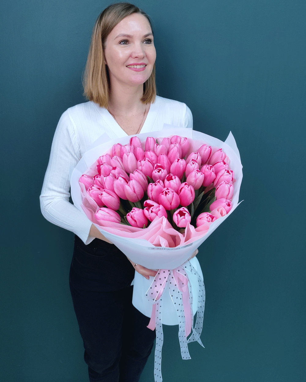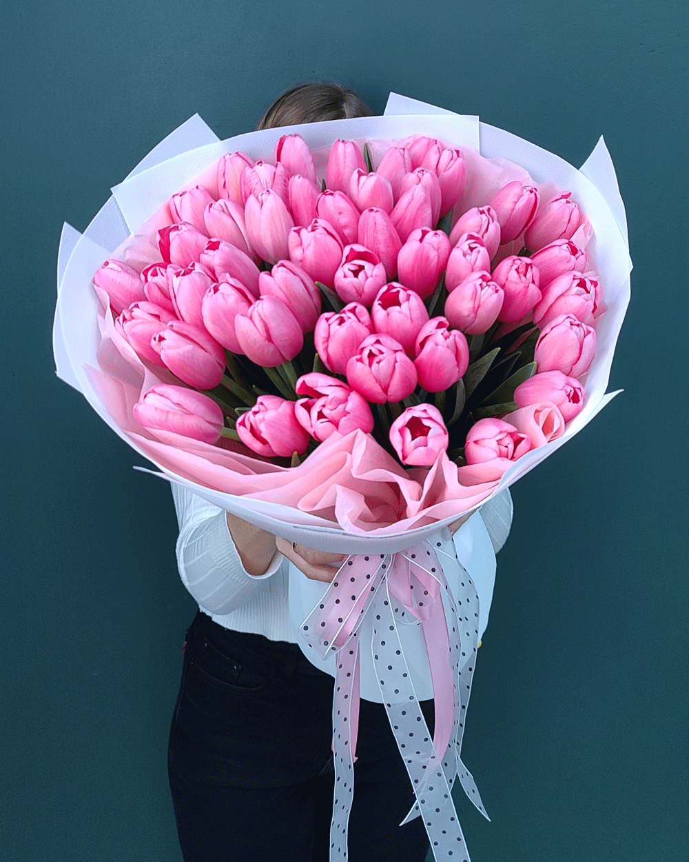 Когда слов недостаточно, на помощь приходит охапка из 51 розового тюльпана. Это по-настоящему масштабный, эффектный и невероятно женственный подарок, который гарантирует WOW-эффект. Насыщенный розовый цвет в таком объеме выглядит как настоящее цветочное море, наполняя дом ароматом весны и свежести.