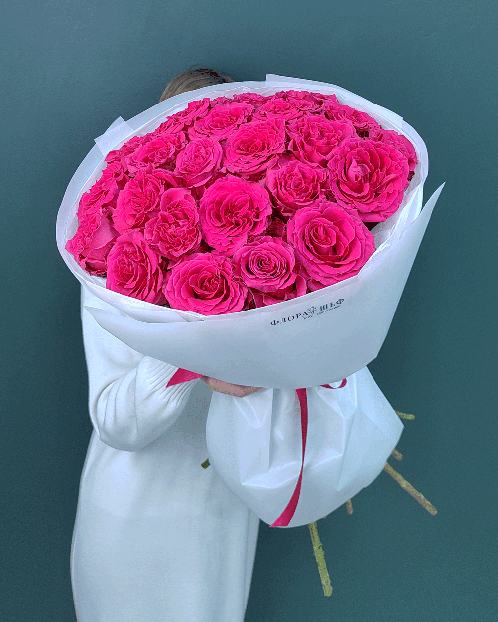 Букет из 25 малиновых роз сорта Фулл Монти — это эффектная цветочная композиция для тех, кто хочет произвести впечатление. Пышное облако из 25 крупных бутонов насыщенного оттенка фуксии выглядит дорого, стильно и невероятно празднично.