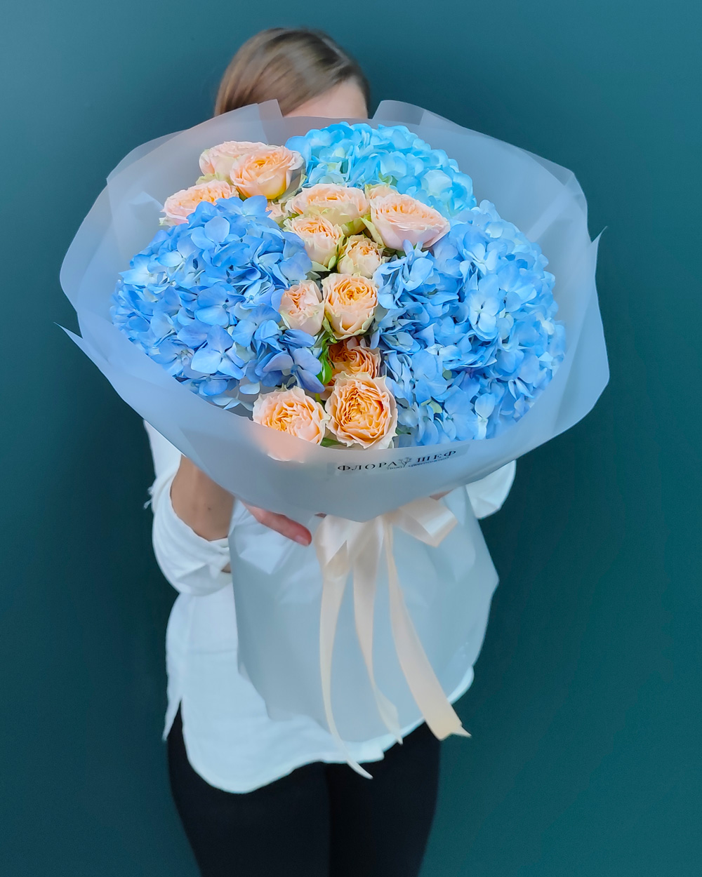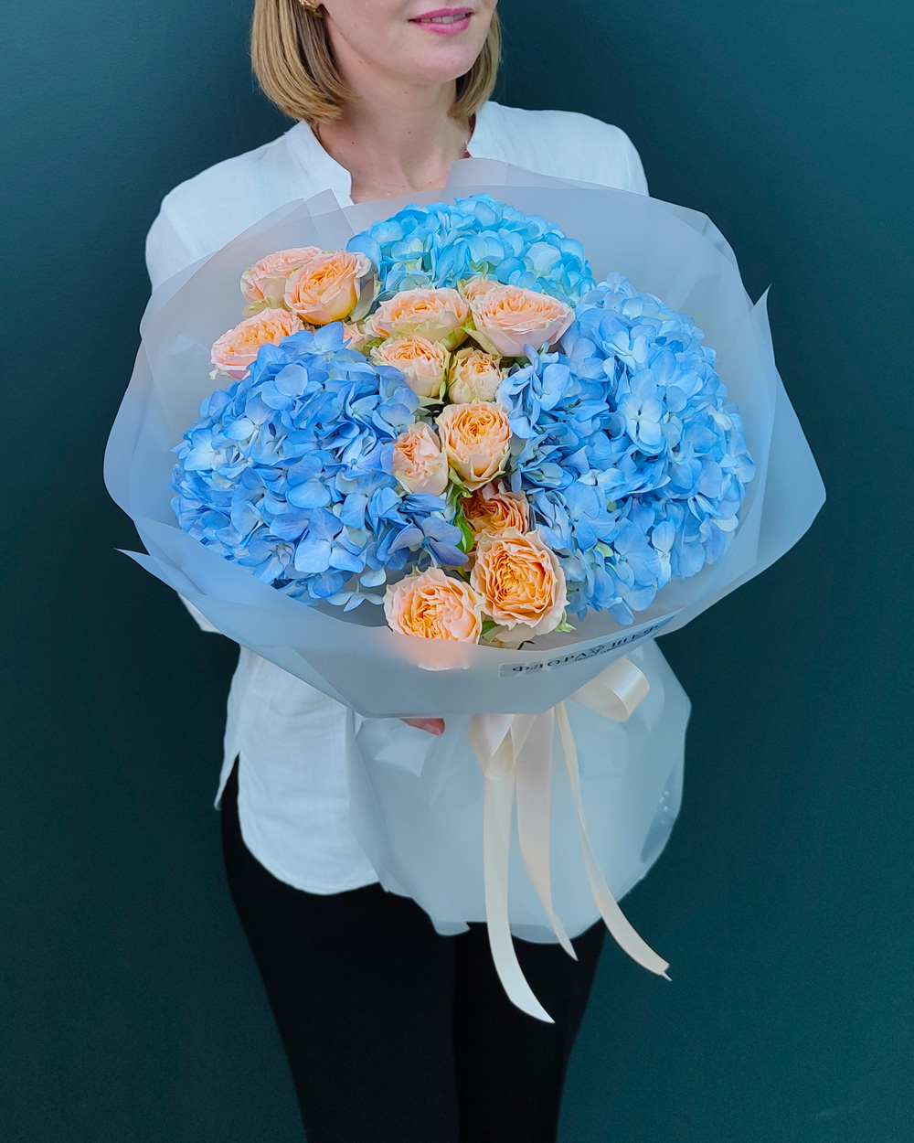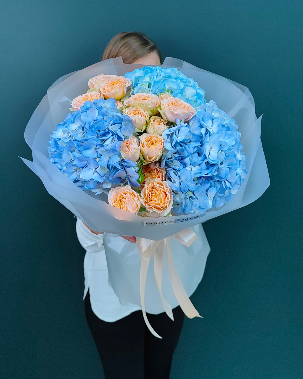 Нежная букет из голубой гортензии и кустовой персиковой розы подойдёт для поздравления с днём рождения, годовщиной, 8 Марта или как романтический подарок. Контраст холодного голубого и тёплого персикового оттенка делает букет выразительным и гармоничным.