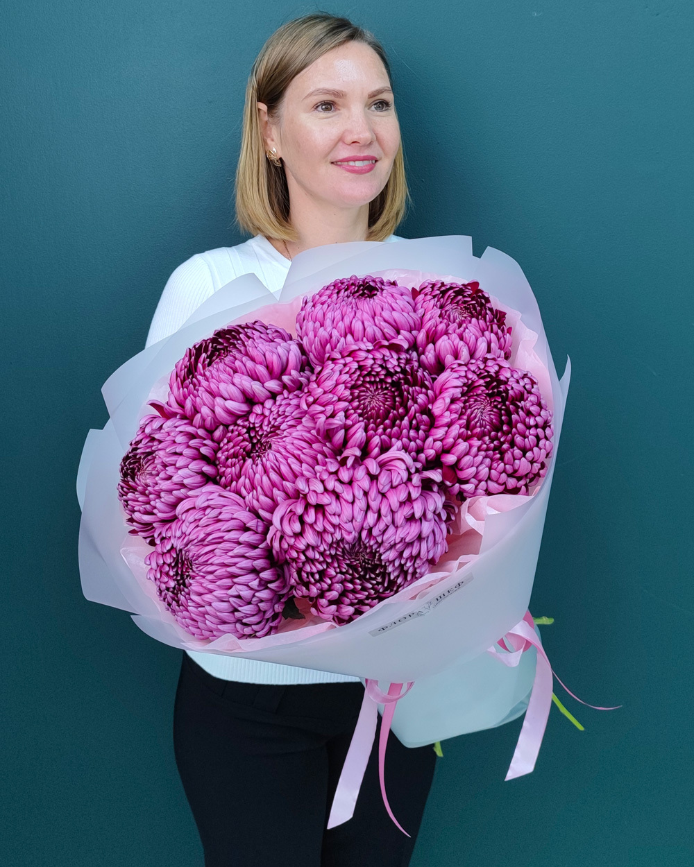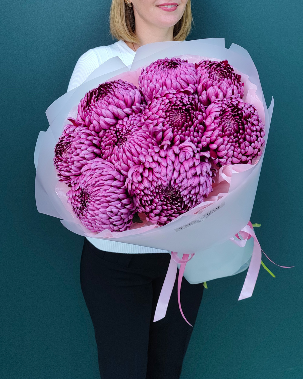 Яркая хризантема сорта Бигуди Перпл с необычной формой лепестков и насыщенным сиреневым оттенком станет выразительным подарком. Такой букет подойдёт для дня рождения, юбилея, корпоративного поздравления или как эффектный сюрприз без повода.