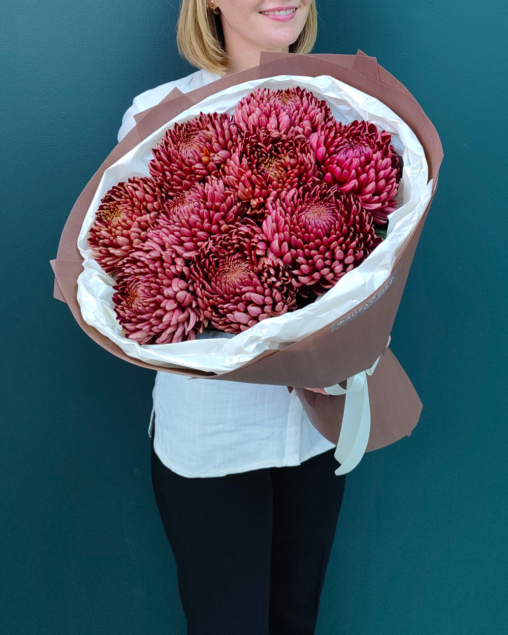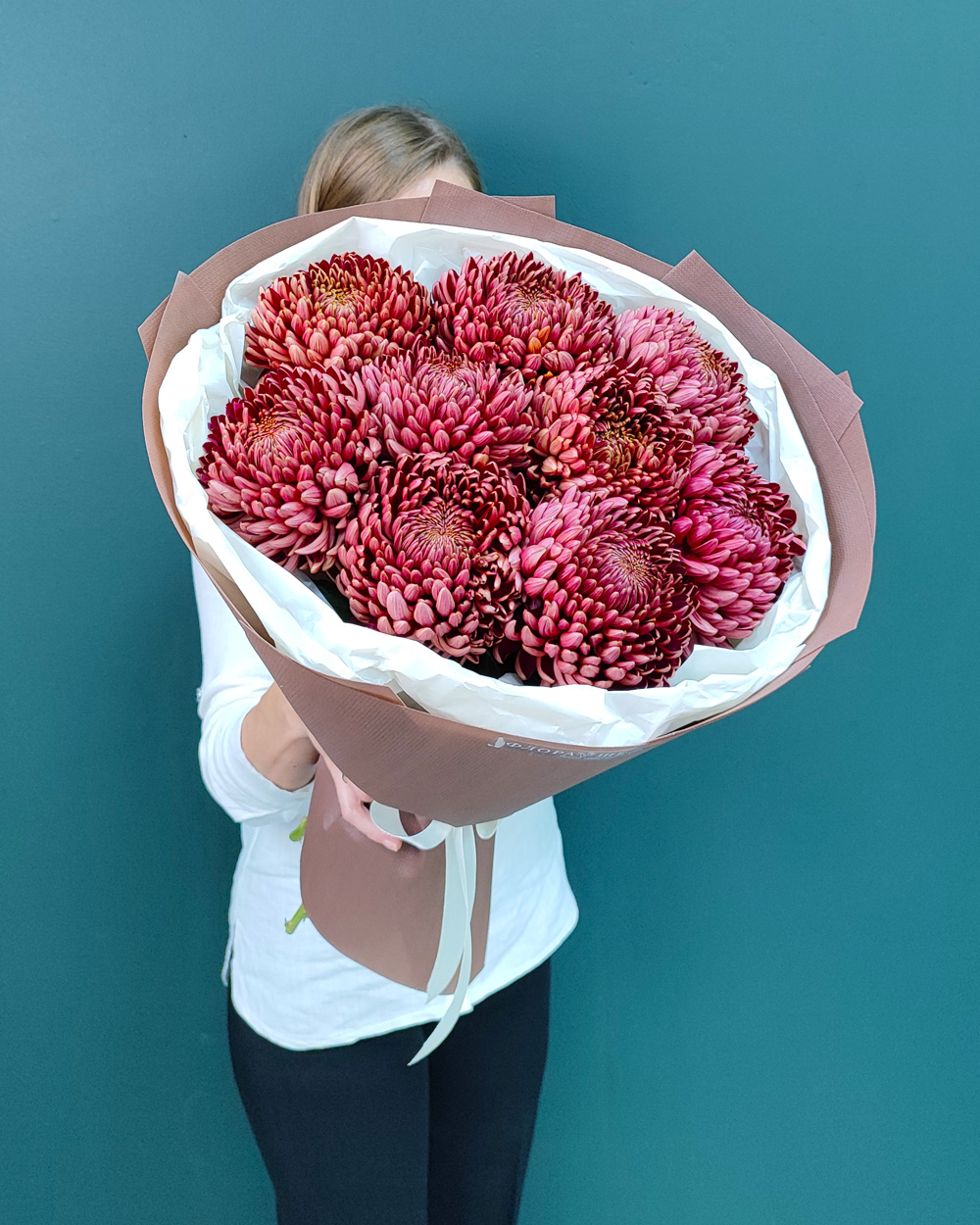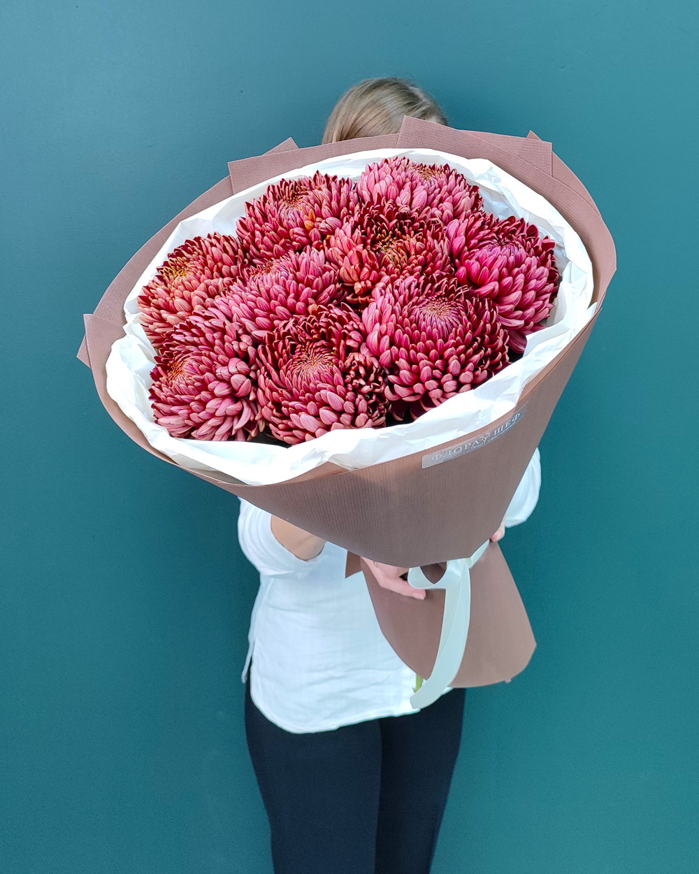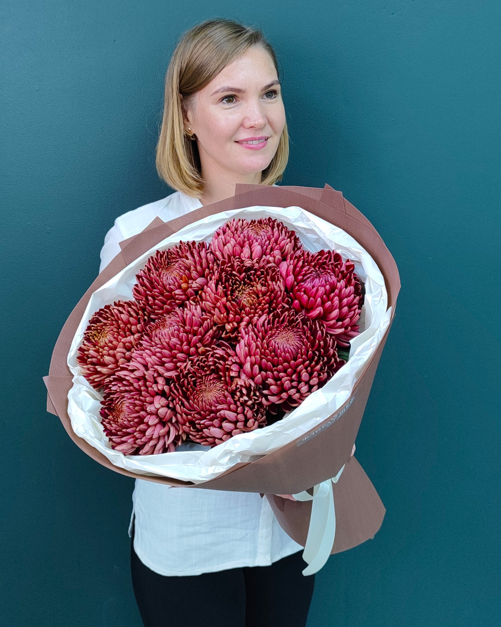 Яркая хризантема сорта Бигуди Ред с насыщенным коричнево-красным оттенком и необычной формой лепестков станет эффектным подарком. Такой букет подойдёт для юбилея, торжественного события, поздравления коллеги или сюрприза для близкого человека.