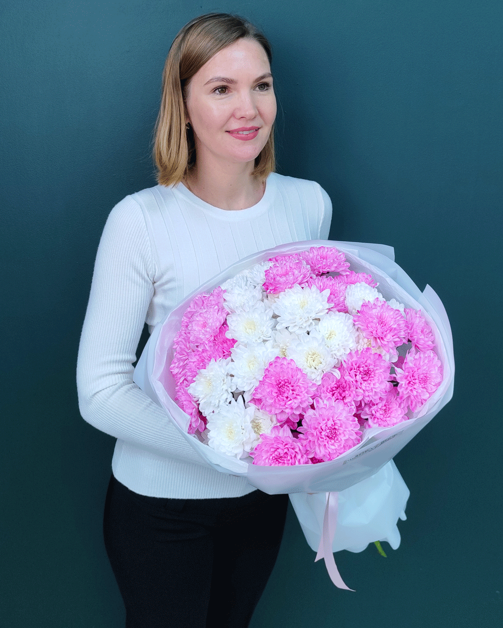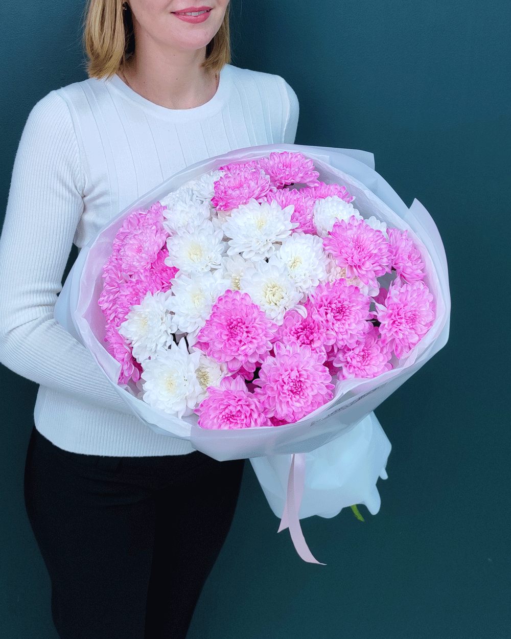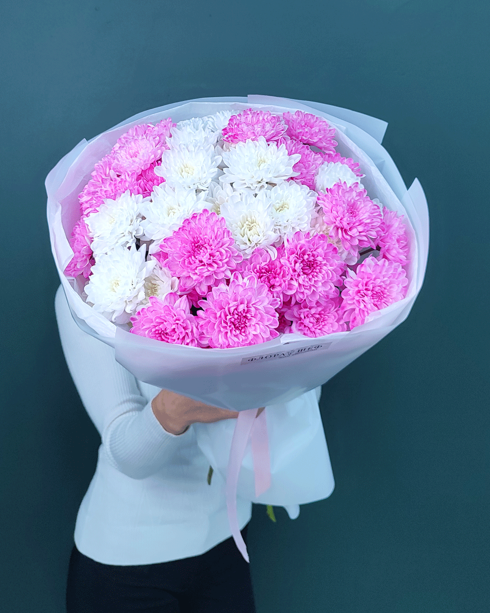 Сочетание белой и розовой кустовой хризантемы создает нежный визуальный контраст и отличается исключительной стойкостью – сохраняет свежесть до 2 недель, радуя получателя своей естественной красотой и жизнерадостностью.