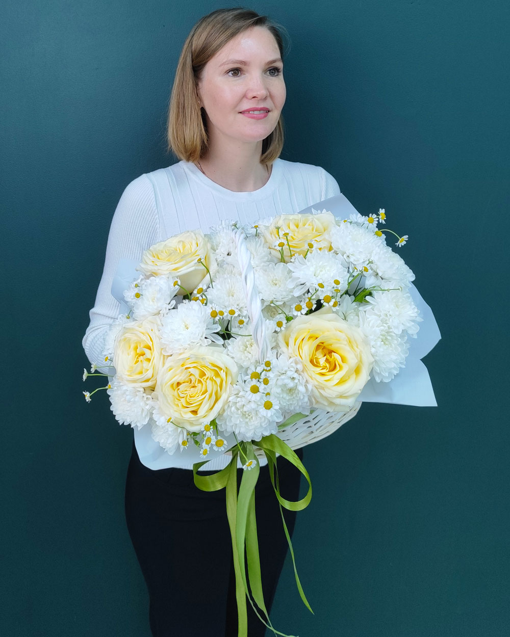 Эта интерьерная корзина сочетает в себе благородство премиальных сортов и легкость цветущего луга. Центром композиции стали кремовые пионовидные розы — воплощение нежности и «тихой роскоши». Дополнение в виде объемной хризантемы и россыпи мелкой матрикарии (садовой ромашки) делает букет воздушным, фактурным и максимально естественным.