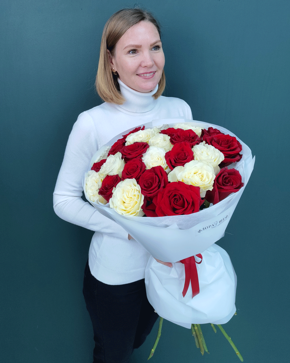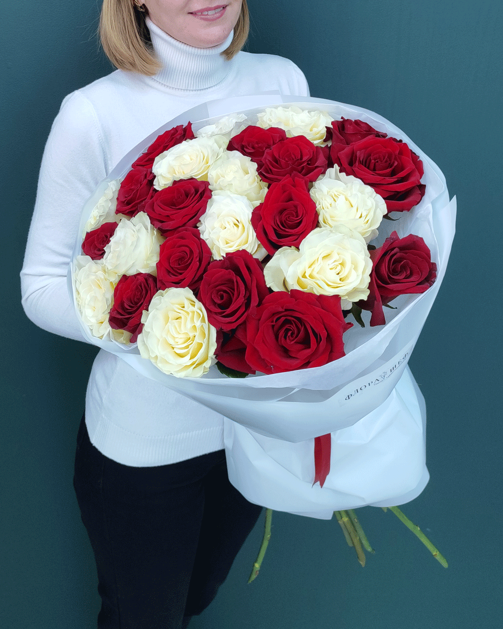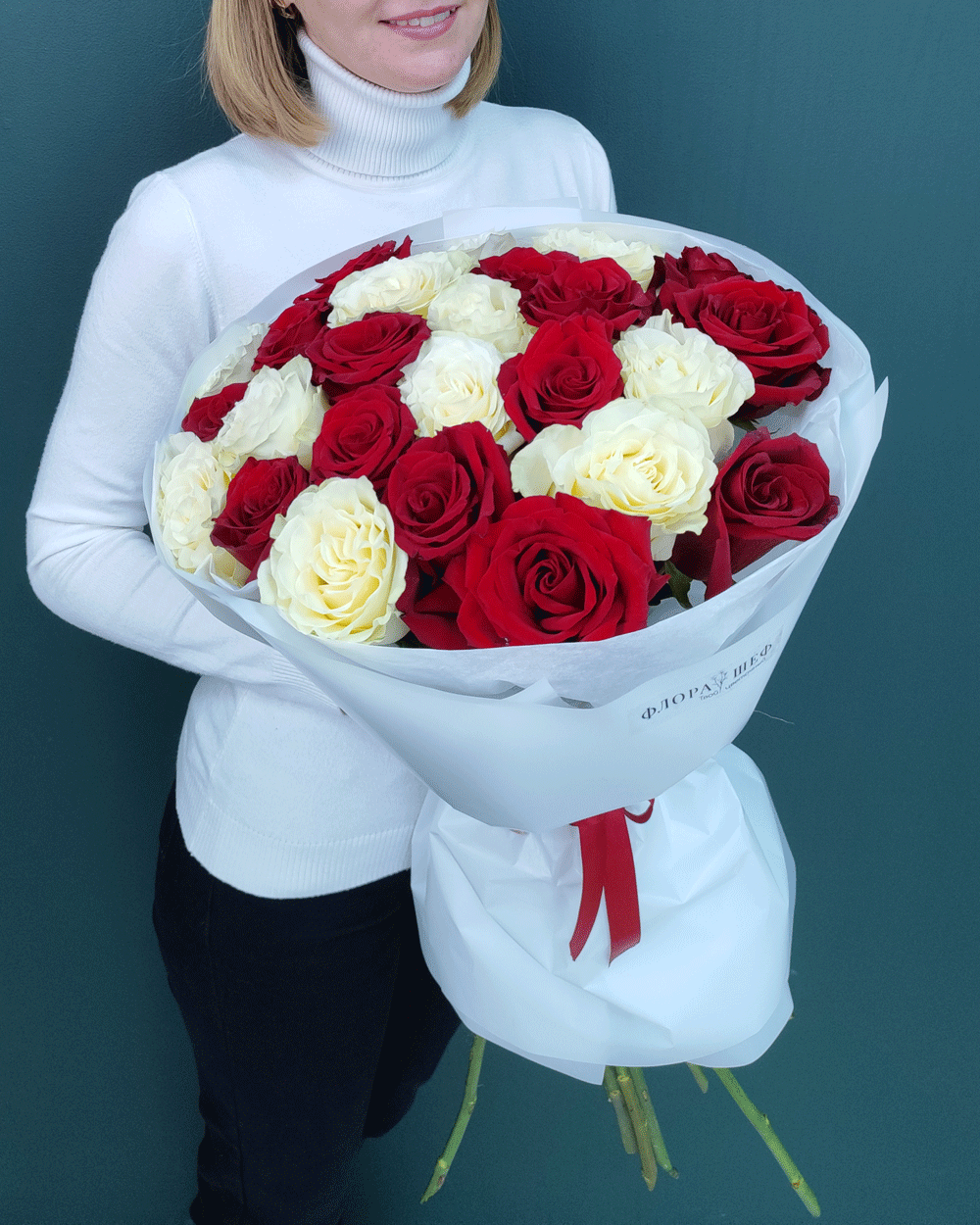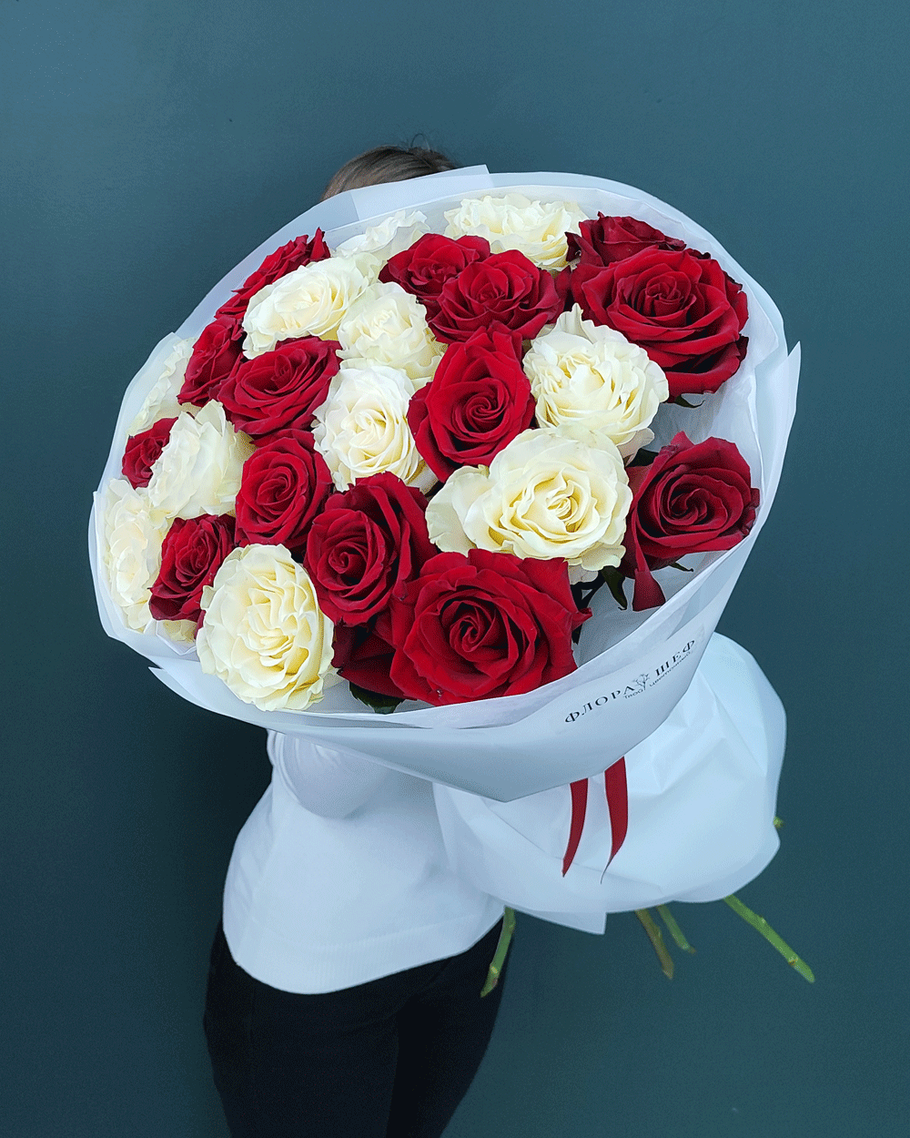 Эффектный букет из 25 красных и белых роз подойдёт для юбилея, признания в любви или важного торжественного события. Контраст оттенков делает композицию яркой, статусной и запоминающейся.