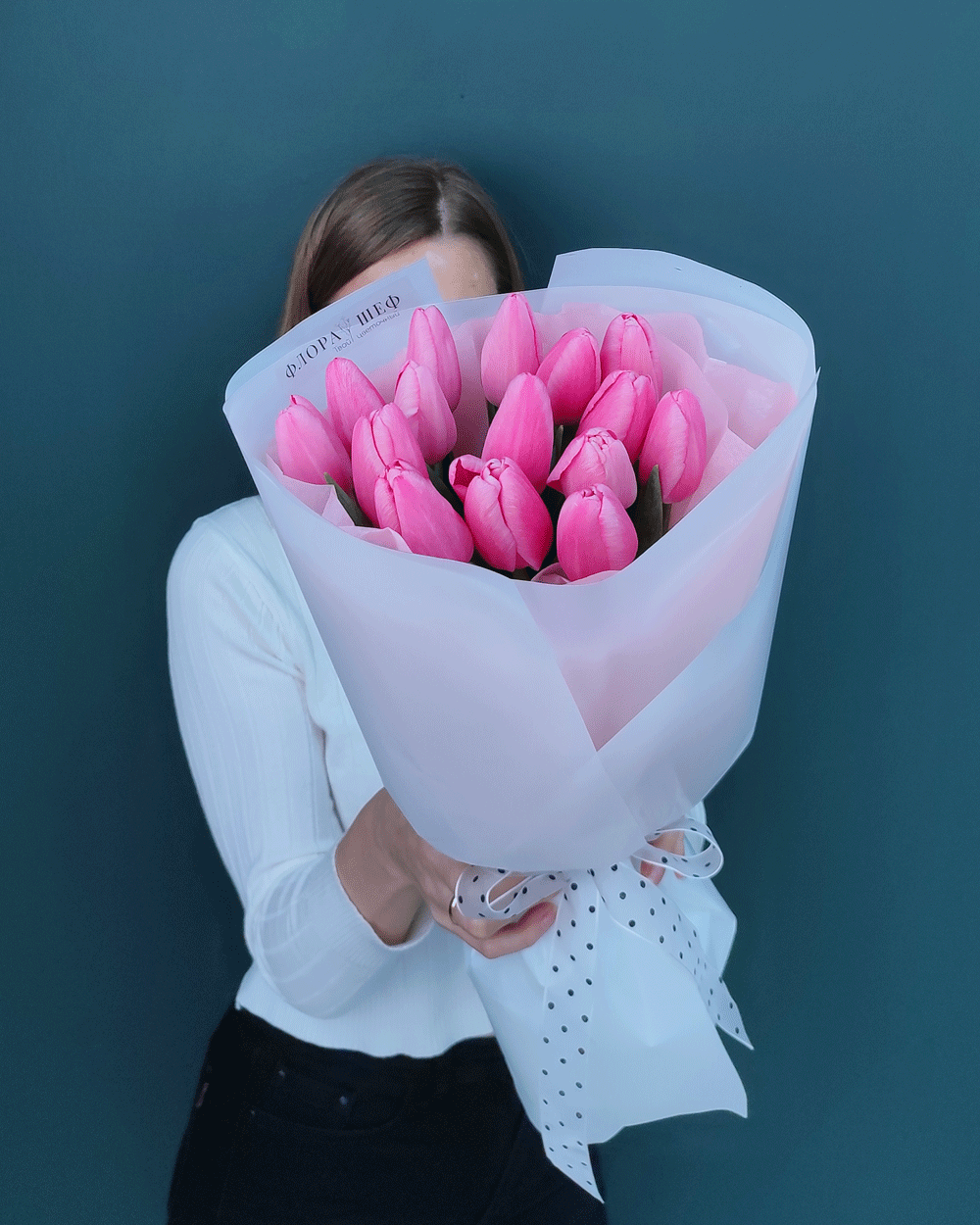 Олицетворение нежности и весеннего вдохновения. Яркие, но в то же время деликатные розовые тюльпаны — идеальный способ выразить симпатию, поблагодарить или просто поднять настроение близкому человеку.