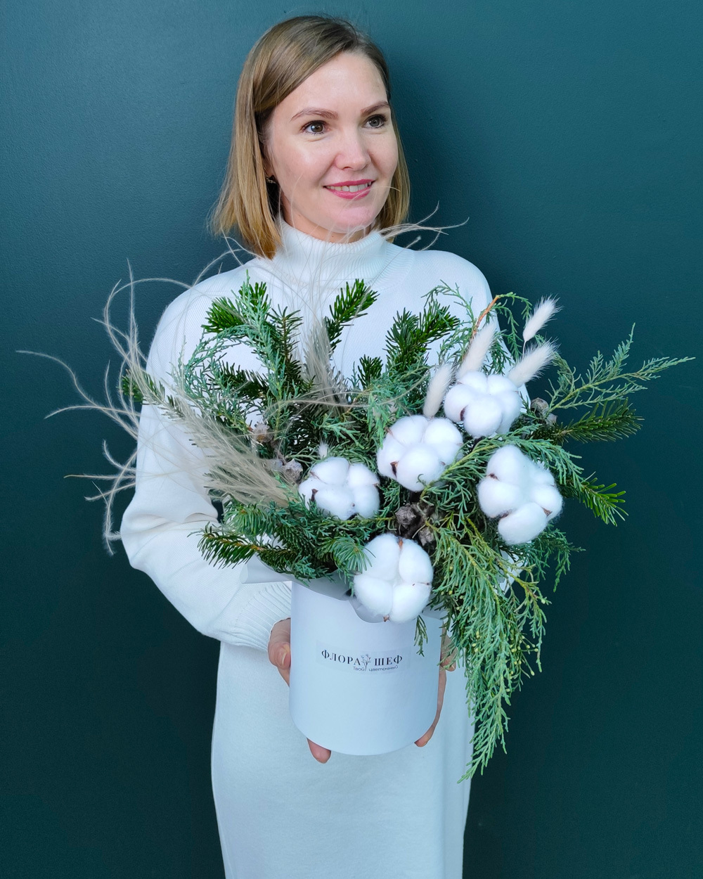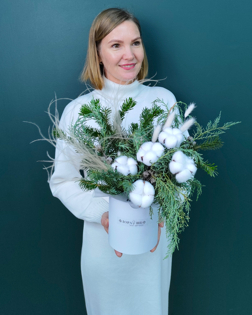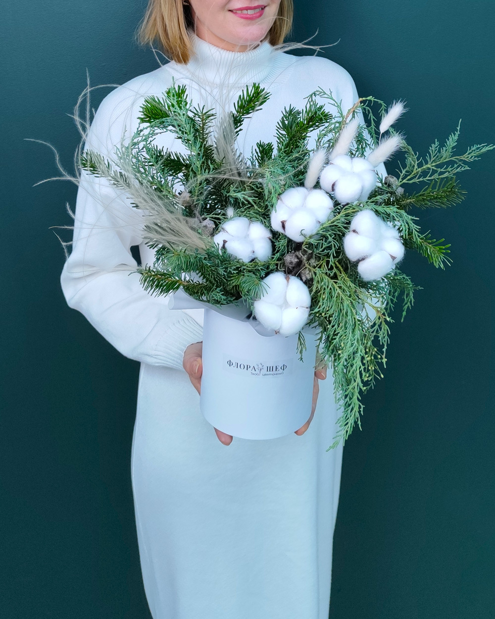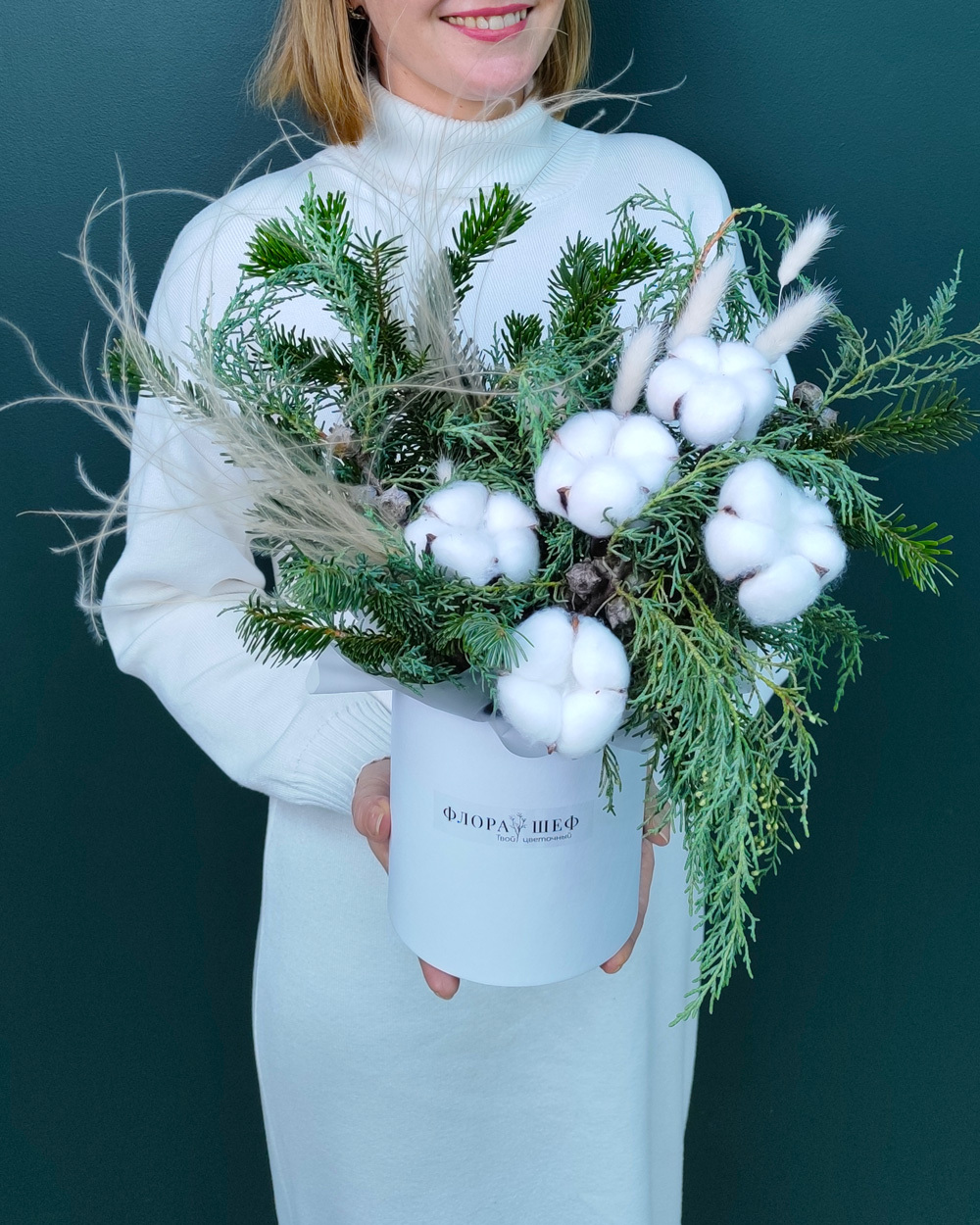 Элегантная зимняя композиция в холодно-снежной палитре создаёт атмосферу морозного утра и праздничного уюта. Подойдёт для украшения дома, подарка близким или эффектного корпоративного презента. Натуральная хвоя долго сохраняет форму и свежий аромат.