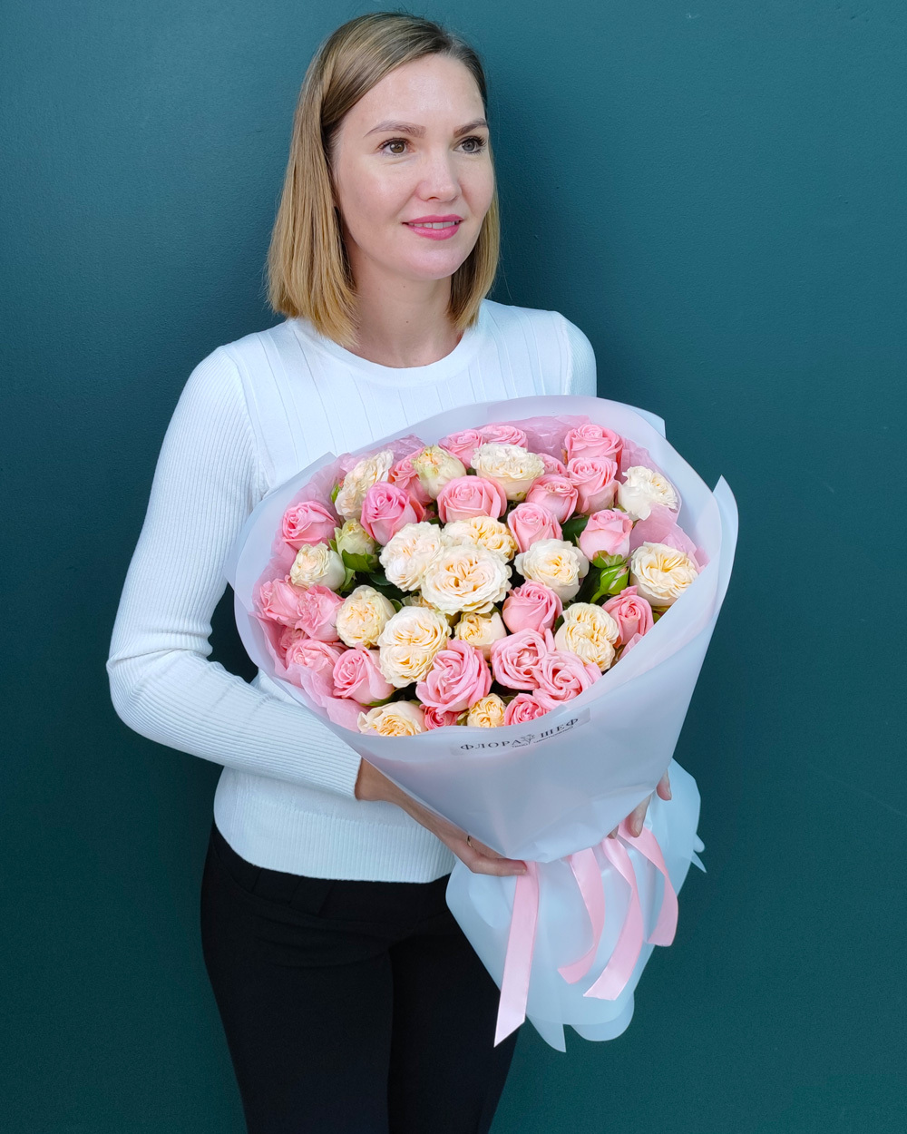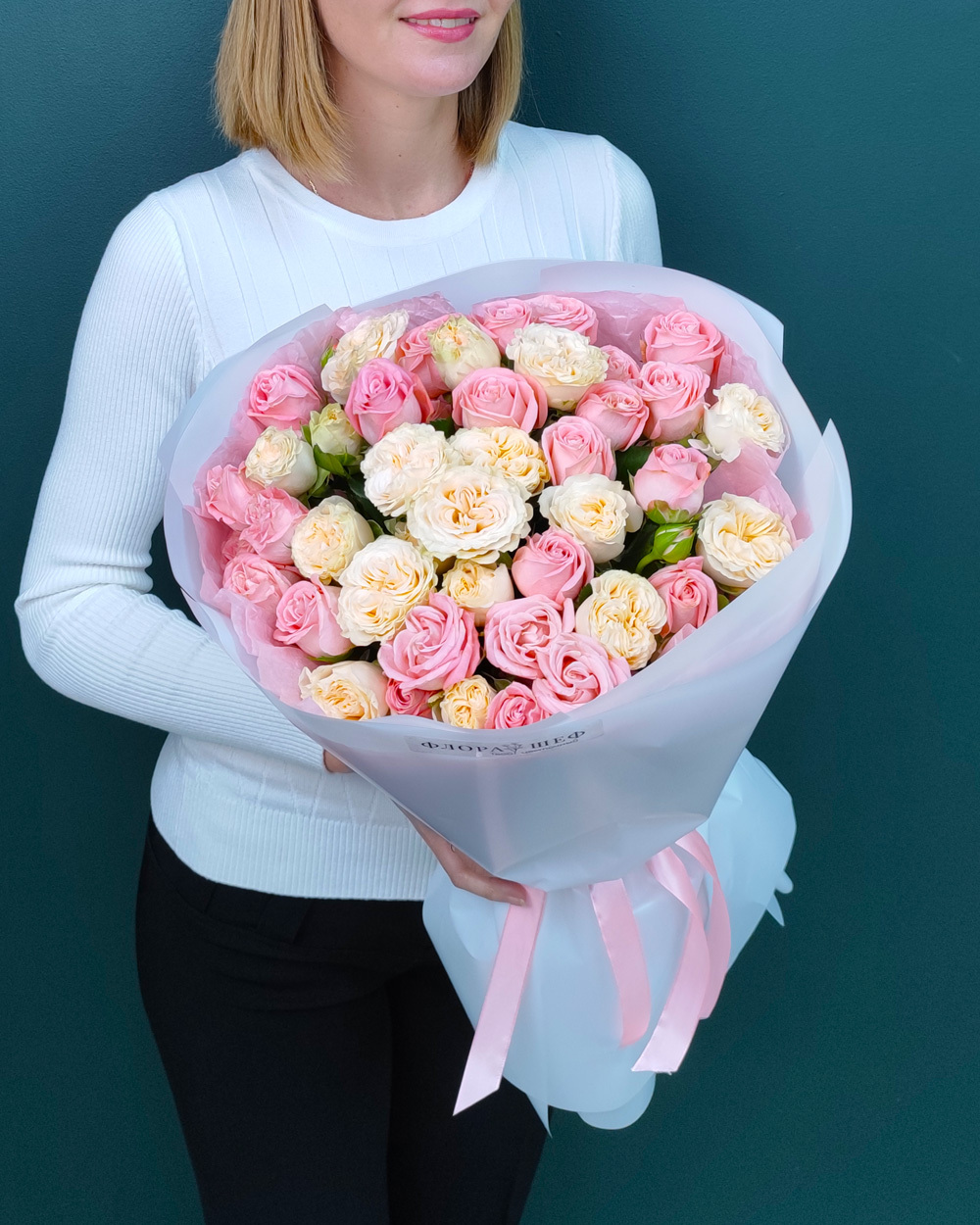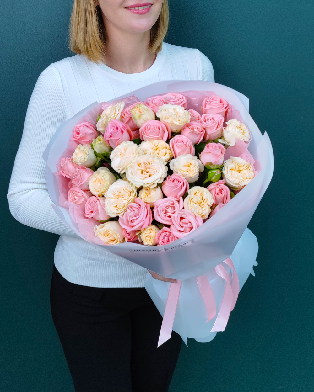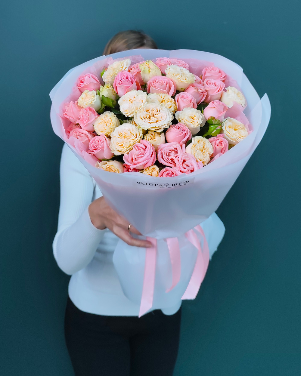 Нежный букет из пионовидных кустовых роз в розовых и кремовых тонах подойдёт для подарка на день рождения, годовщину или как знак внимания. Тёплая цветовая палитра создаёт атмосферу уюта и романтики.