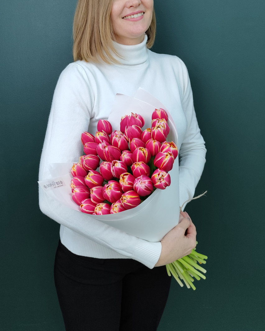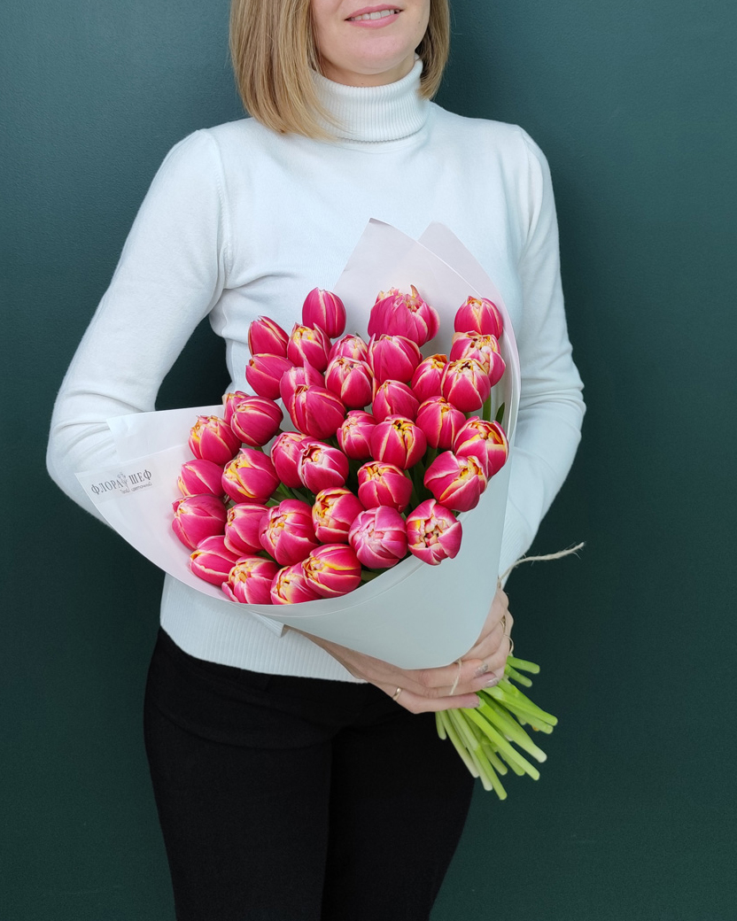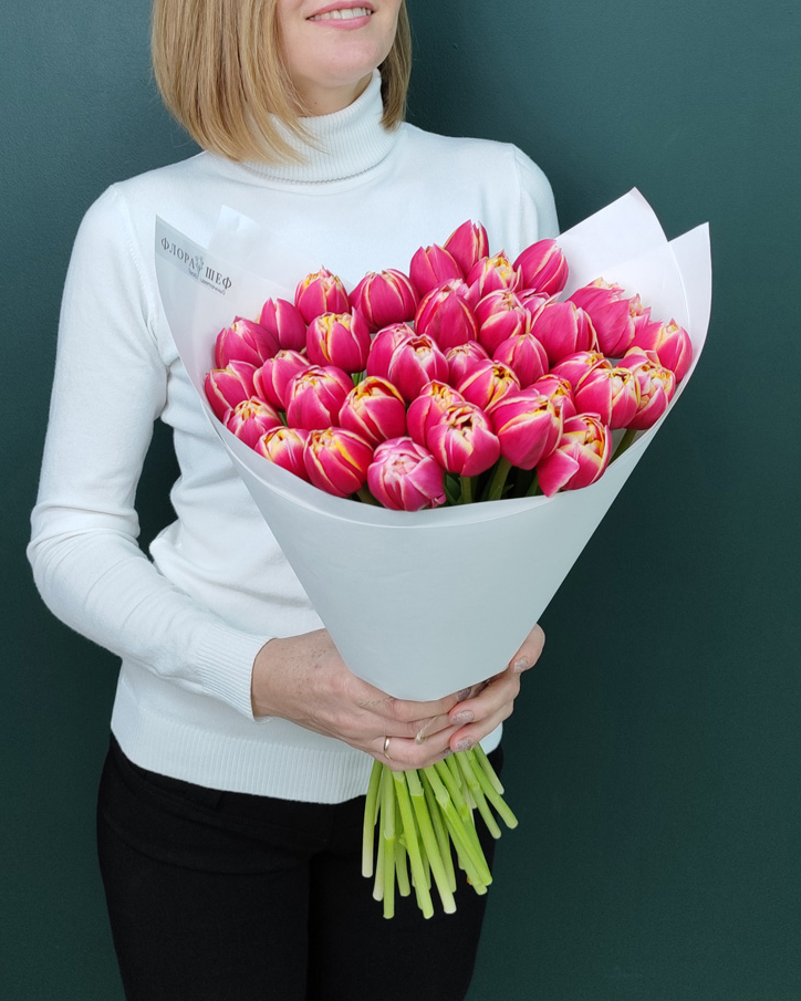 Подарите себе или своим близким этот великолепный букет тюльпанов пионовидной формы "Колумбус". Его нежный розовый цвет и изысканная форма делают его идеальным выбором для любого случая — от романтического подарка до украшения праздничного стола.