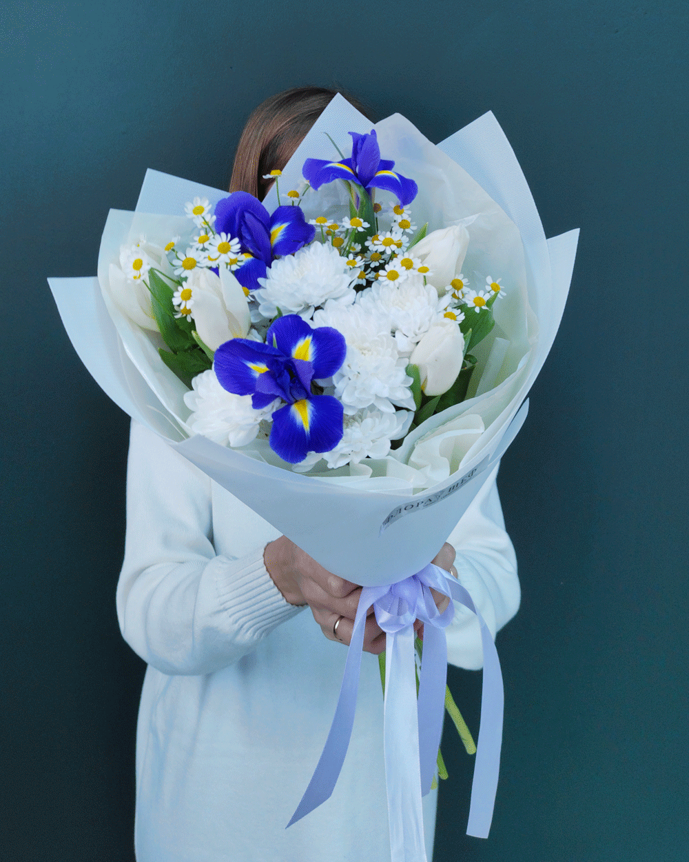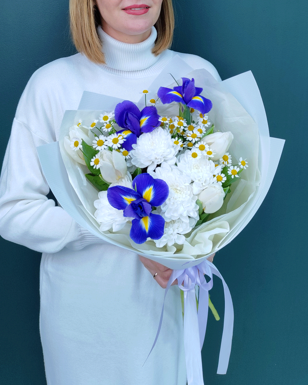 Сочное и жизнерадостное сочетание глубоких синих ирисов, нежных тюльпанов и пушистых ромашек. Букет наполнен свежестью и весенним настроением, идеально подходит для подарка «просто так» или на особенное событие.