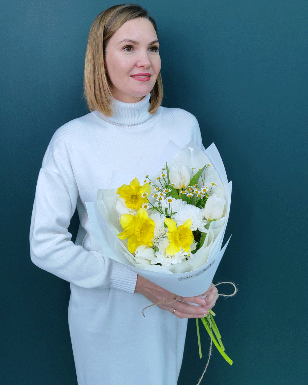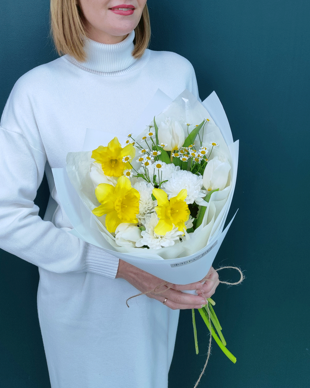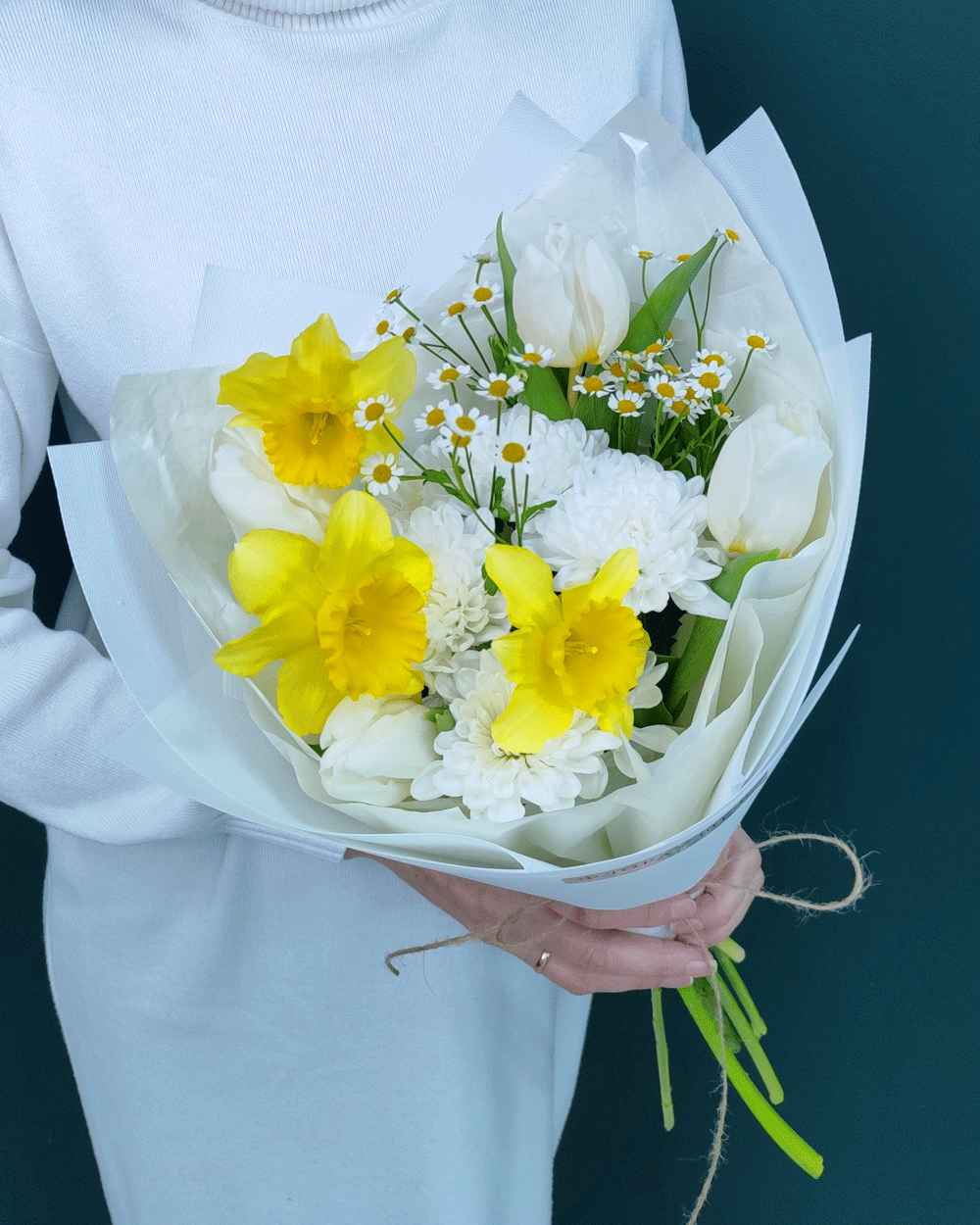Солнечный и легкий букет, воплощающий пробуждение природы. Сочетание сезонных нарциссов и белоснежных тюльпанов с хризантемой и ромашкой создает объемную композицию с настоящим ароматом весны.